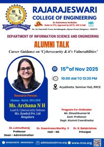 The Department of ISE successfully conducted an insightful Alumni Talk featuring Ms. Archana N H, who shared her expertise on cybersecurity threats, defense mechanisms, and industry best practices. The session provided students with practical knowledge, real-world examples, and valuable career guidance in the field of cybersecurity.