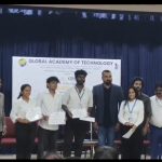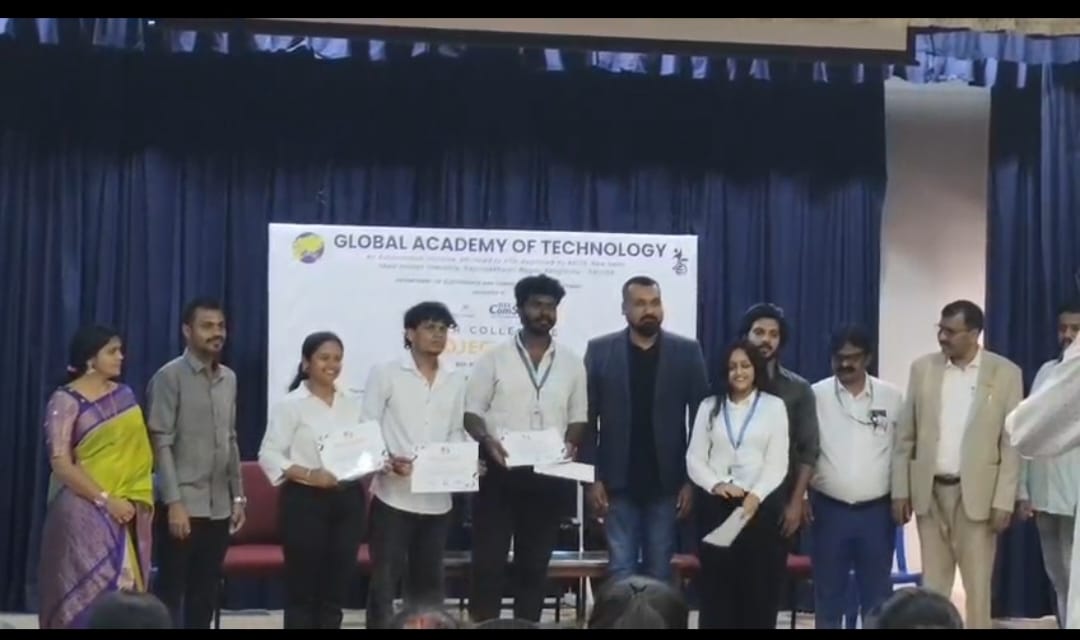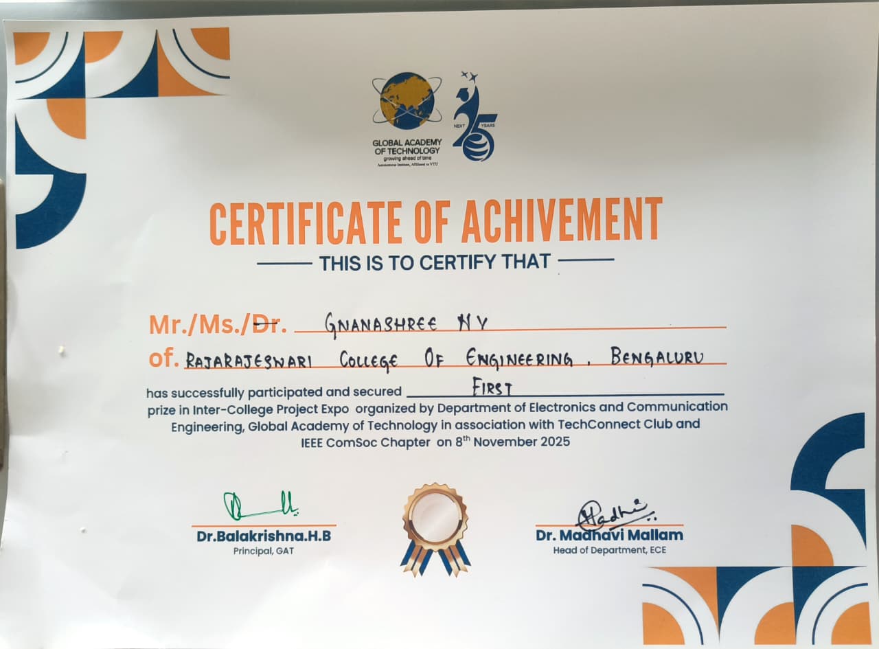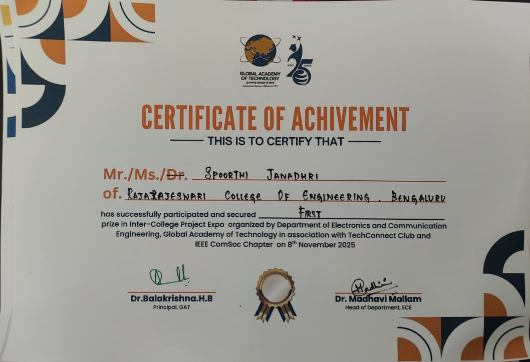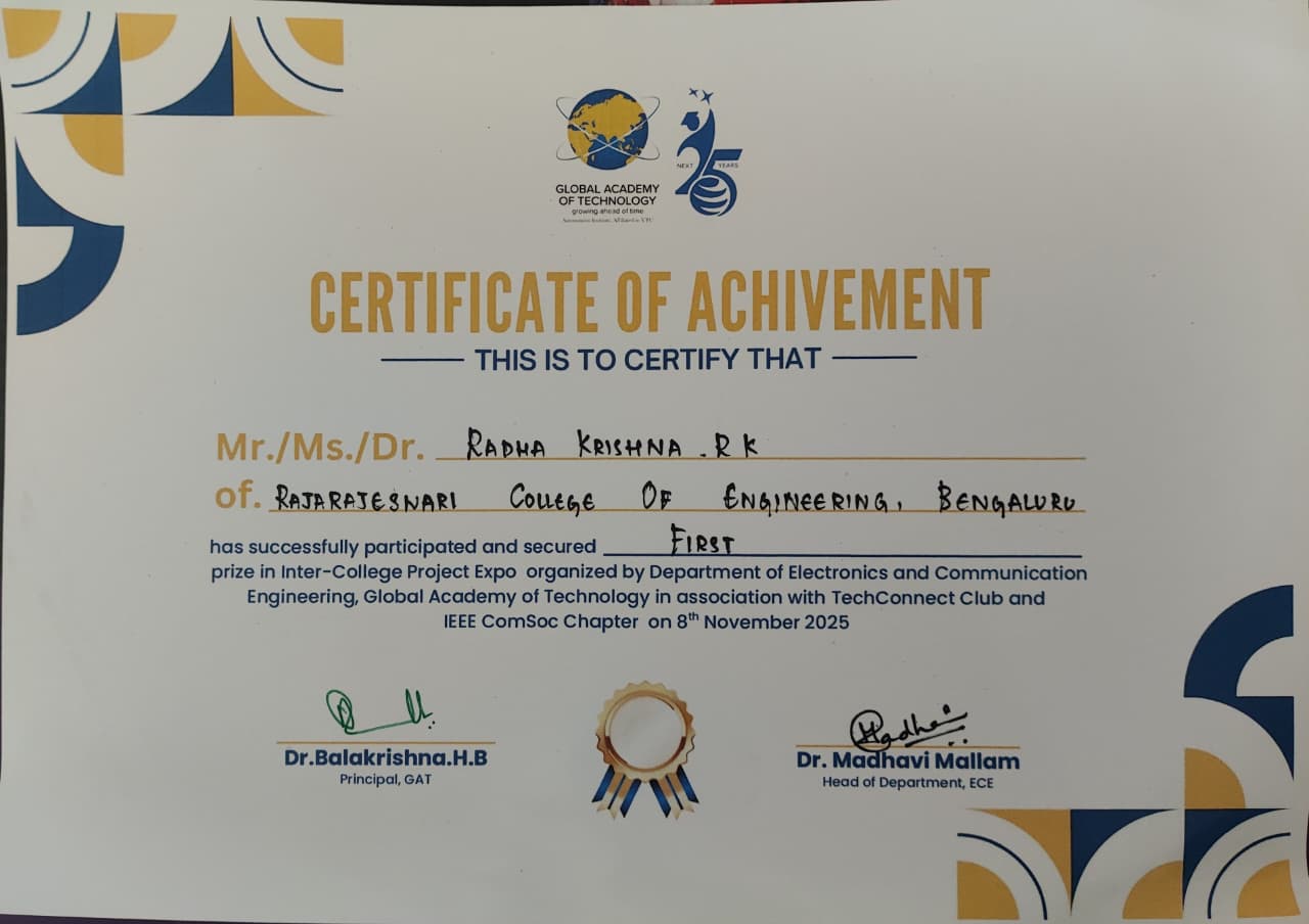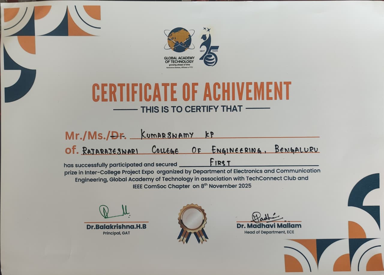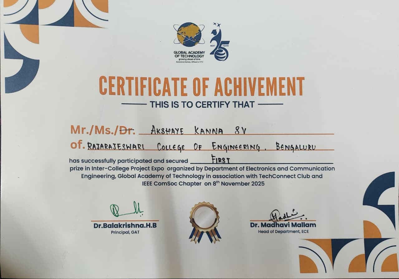 Akshaye Kanna S.V (1RR22RA003), Gnanashree N.V (1RR22RA007), Kumarswamy K.P (1RR22RA012), and Spoorthi Janadri (1RR22RA026) — clinch the 1st Prize at the Inter-College Project Expo hosted by Global Academy of Technology on 8th November 2025.