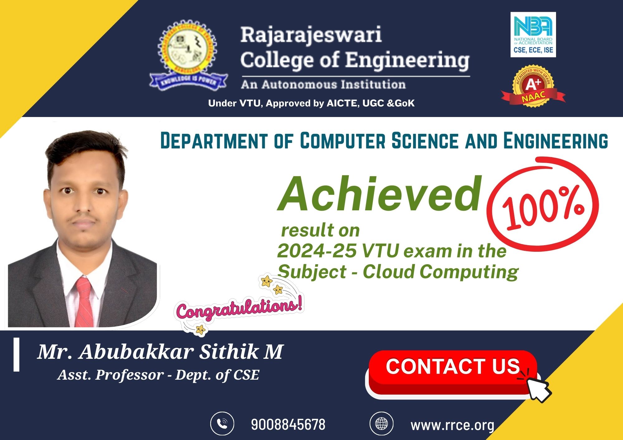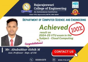 The Department of Computer Science and Engineering at Rajarajeswari College of Engineering is proud to announce a 100% result in the 2024-25 VTU Examination for the subject Cloud Computing.