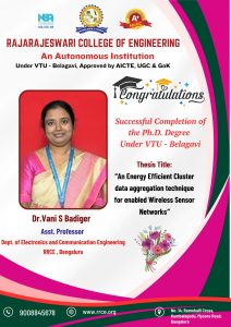 Congratulations to Dr. Vani S. Badiger, Assistant Professor, Department of Electronics and Communication Engineering, RRCE, Bengaluru, on the successful completion of her Ph.D. degree under VTU, Belagavi.