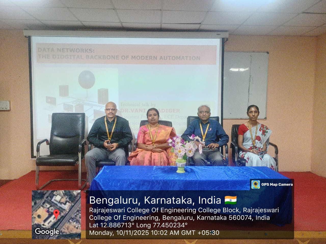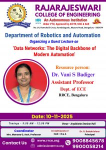Rajarajeswari College of Engineering, Department of Robotics and Automation, is organizing a Guest Lecture on “Data Networks: The Digital Backbone of Modern Automation” on 10-11-2025 at Aryabhatta Seminar Hall