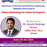 The Department of Electrical and Electronics Engineering, RRCE successfully organized a guest lecture on “Modern Methodology for Product Development.” The session was delivered by Mr. Kotresh Mundrungi, Director, Indian Tech-Keys, Bengaluru, who shared valuable industry insights on modern product development methodologies, innovation practices, and real-world applications. The interactive discussion and practical perspectives made the session highly engaging and beneficial for students.