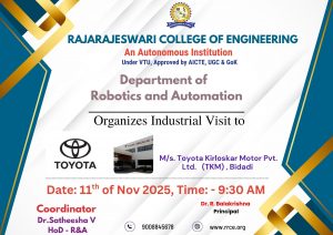 The Department of Robotics and Automation, Rajarajeswari College of Engineering, is organizing an Industrial Visit to M/s. Toyota Kirloskar Motor Pvt. Ltd. (TKM), Bidadi. The visit aims to provide students with practical exposure to modern manufacturing technologies, robotic automation, and smart production systems used in the automotive industry. This initiative bridges theoretical learning with real-world industrial practices, enhancing students’ understanding of automation and innovation in engineering.
