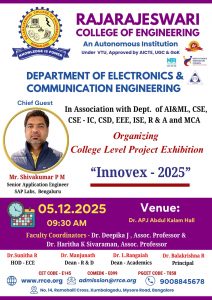 The Department of Electronics & Communication Engineering, in collaboration with AI&ML, CSE, CSE–IC, CSD, EEE, ISE, Robotics & Automation, and MCA, is organizing the College Level Project Exhibition – “Innovex 2025” on 05 December 2025. The event will be held at Dr. APJ Abdul Kalam Hall from 09:30 AM, with Mr. Shivakumar P M, Senior Application Engineer at SAP Labs Bengaluru, as the Chief Guest.