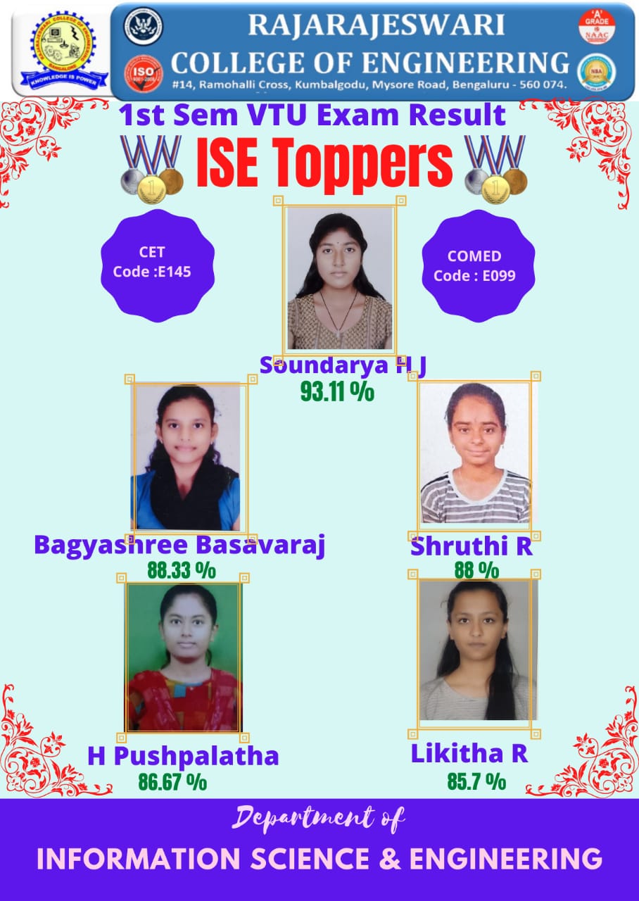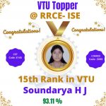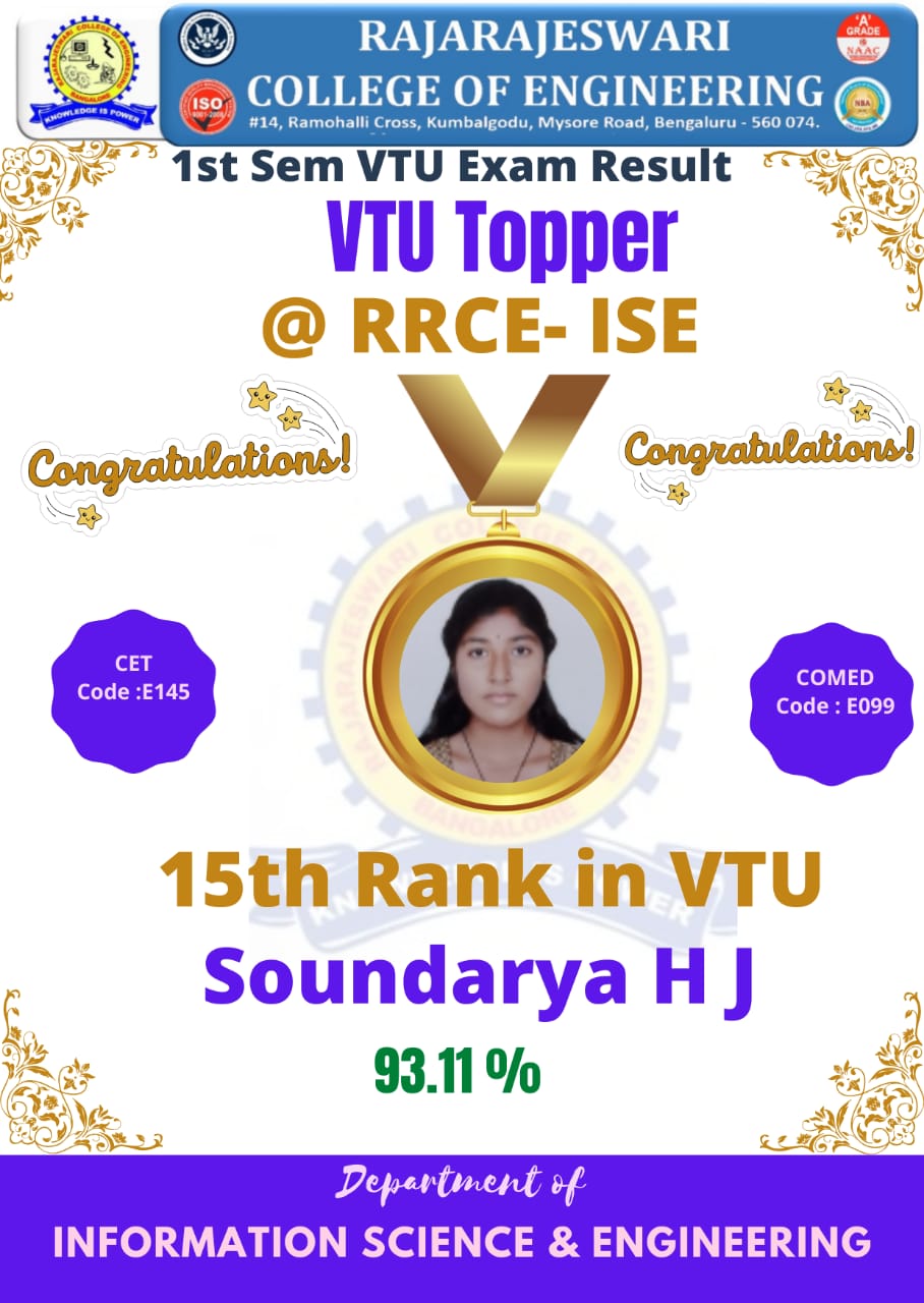 Department of #Information Science and Engineering of #RRCE students Ms. Soundarya H J secured 93.11%, Ms. Bagyashree Basavaraj secured 88.33%, Ms.Shruthi (88.0%) , Ms.H. Pushpalatha (86.67 %) and Ms.Likitha R(85.7%) of overall percentage, first class with distinction and class toppers during the VTU First Semester University Examinations held during Feb/ March 2022.