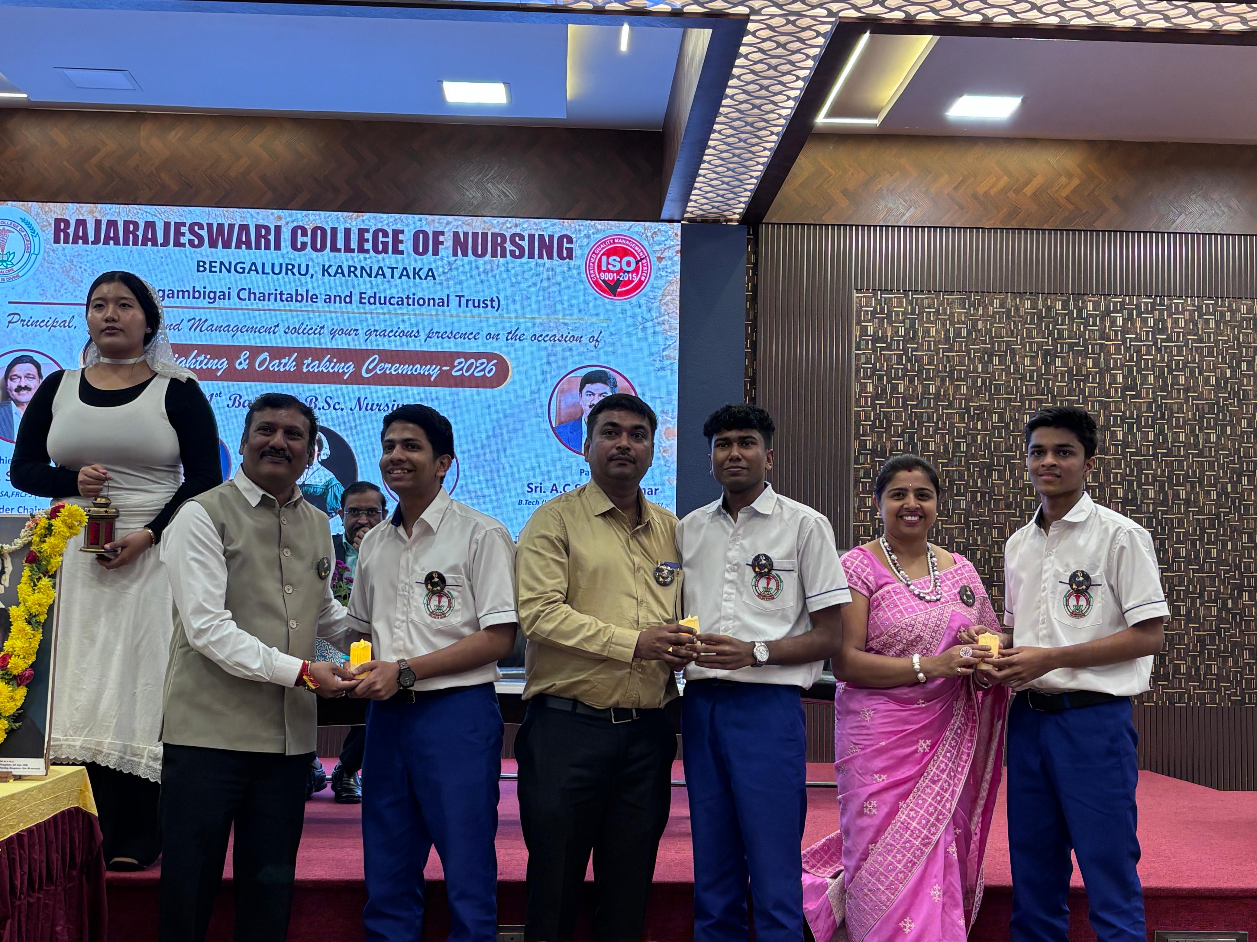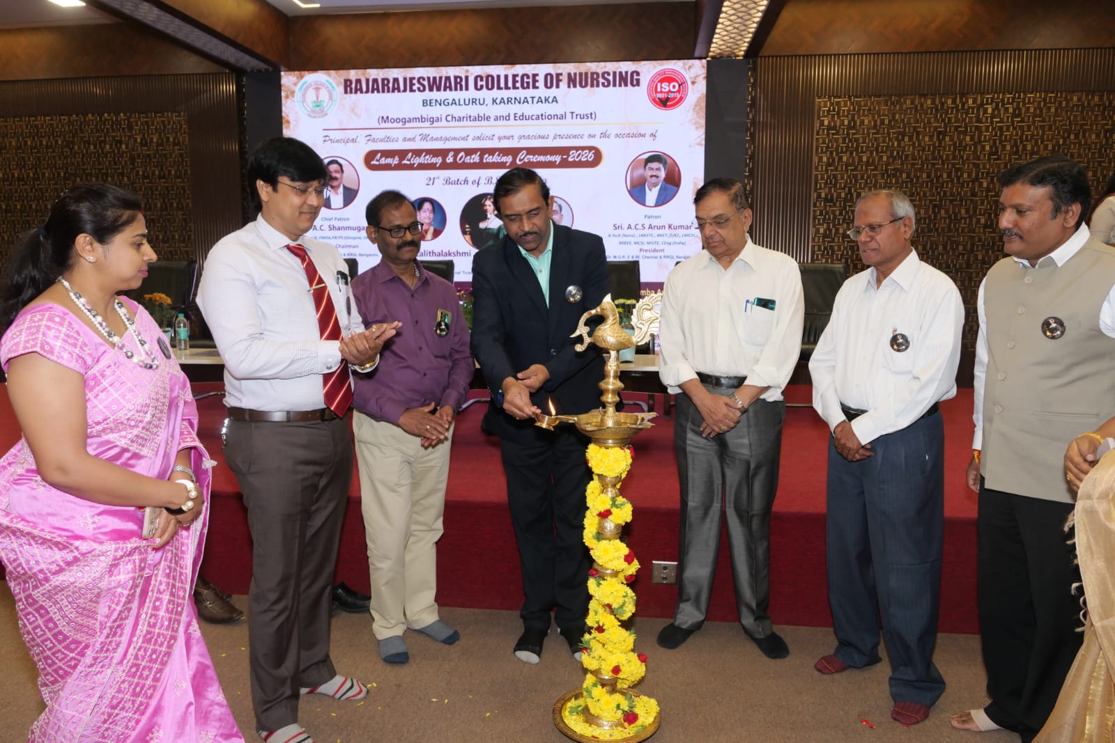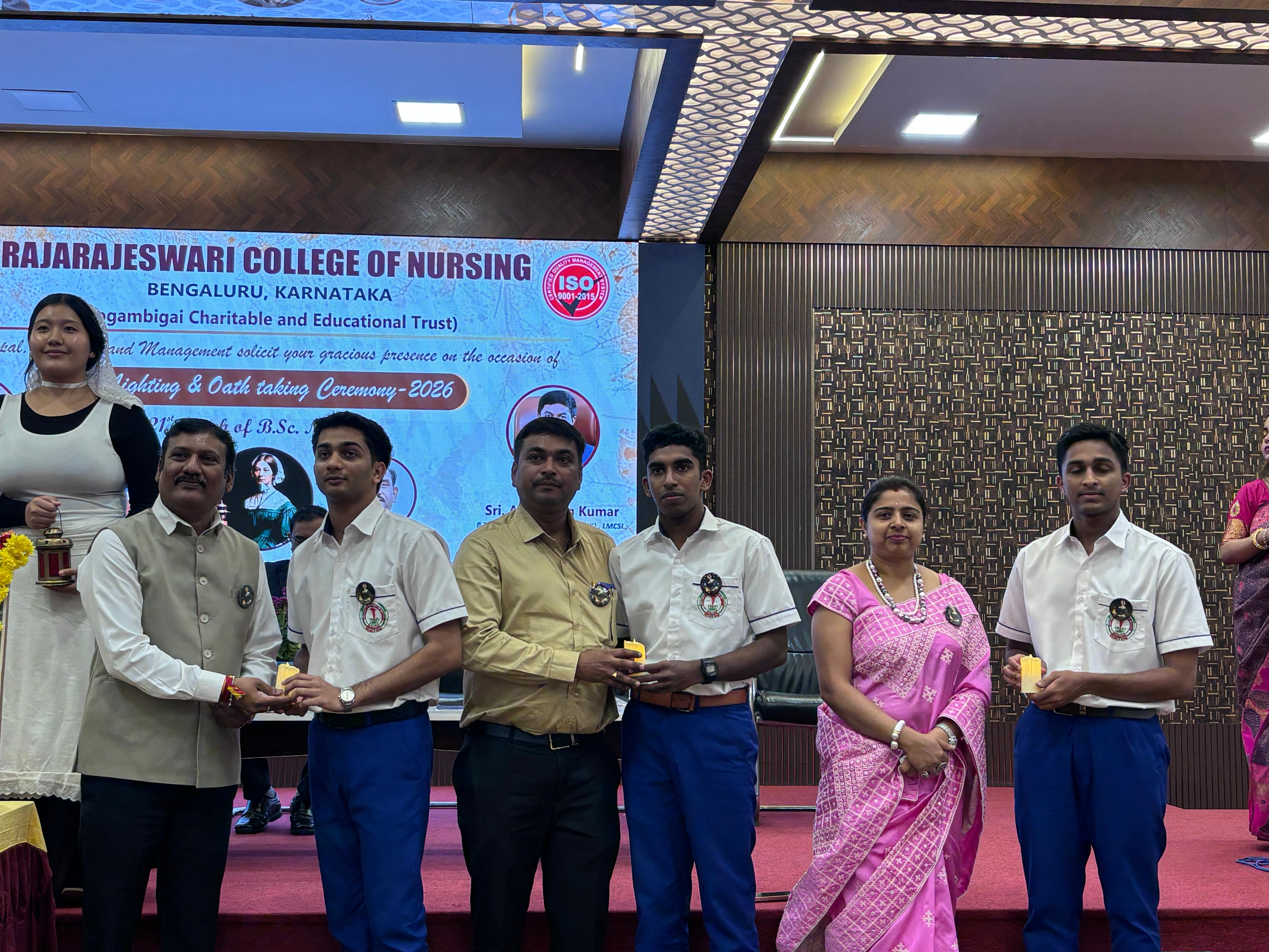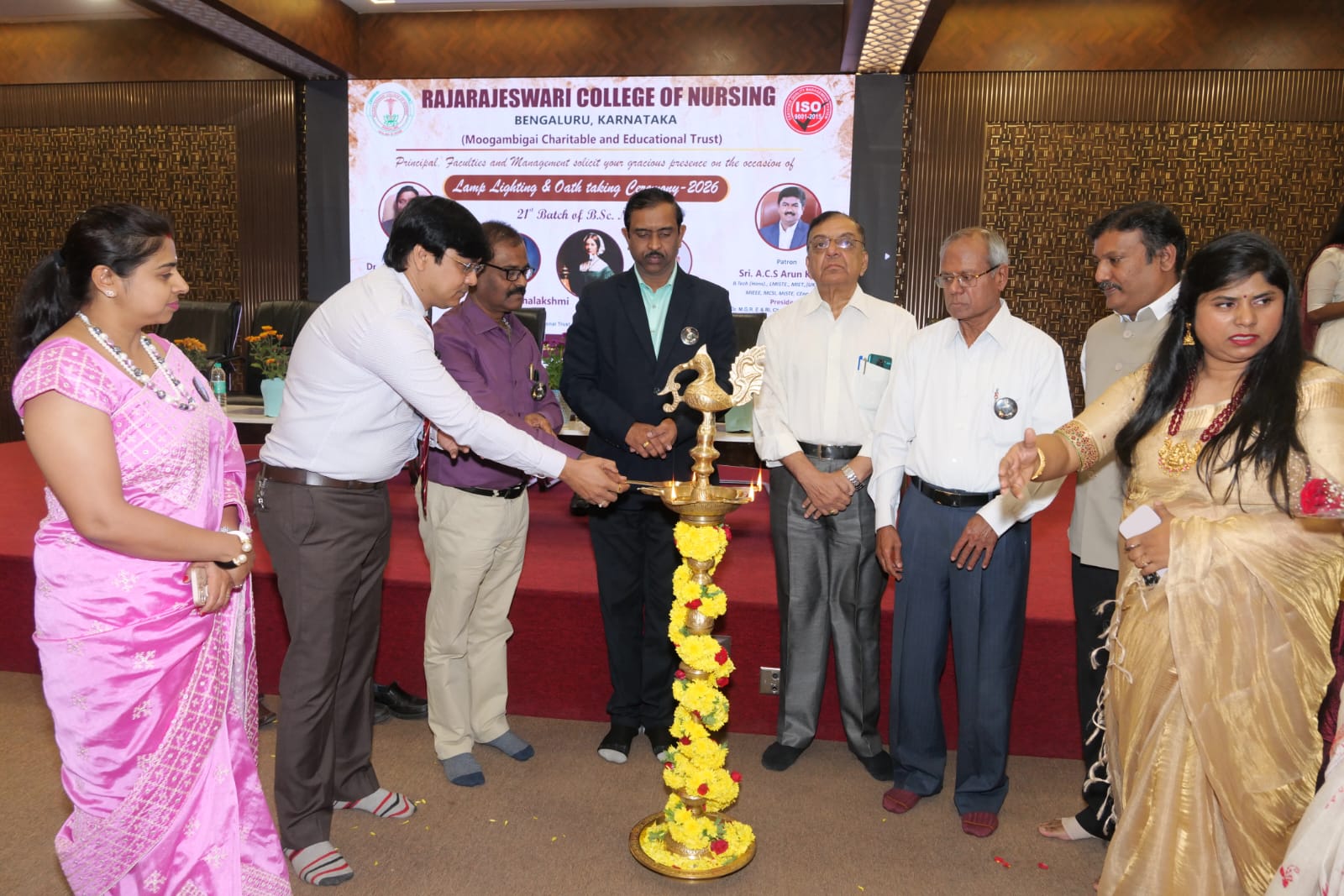 The 21st Lamp Lighting and Oath-Taking Ceremony was organized by RajaRajeswari College of Nursing on 21–01–2026. The ceremony was inaugurated by the Chief Guest, Mr. Shrikant Pulhari, Asst. Director of Nursing Education along with Mr. Seetharam C N, CEO; Dr. Sathyamurthy, Dean; Dr. Praveen Kumar, Medical Superintendent and Dr. Basavaraj Bandari, Principal, RRMCH. The lighting of the lamp symbolized the transmission of knowledge, wisdom, and professional values to the new generation of nursing students.