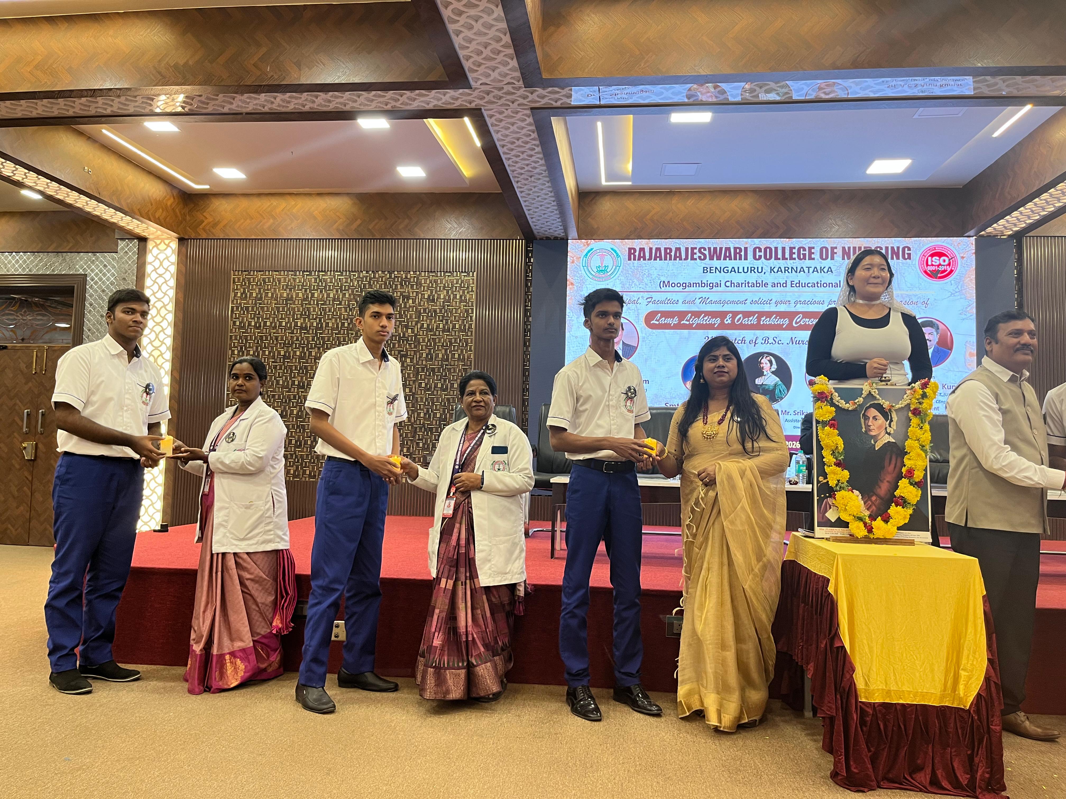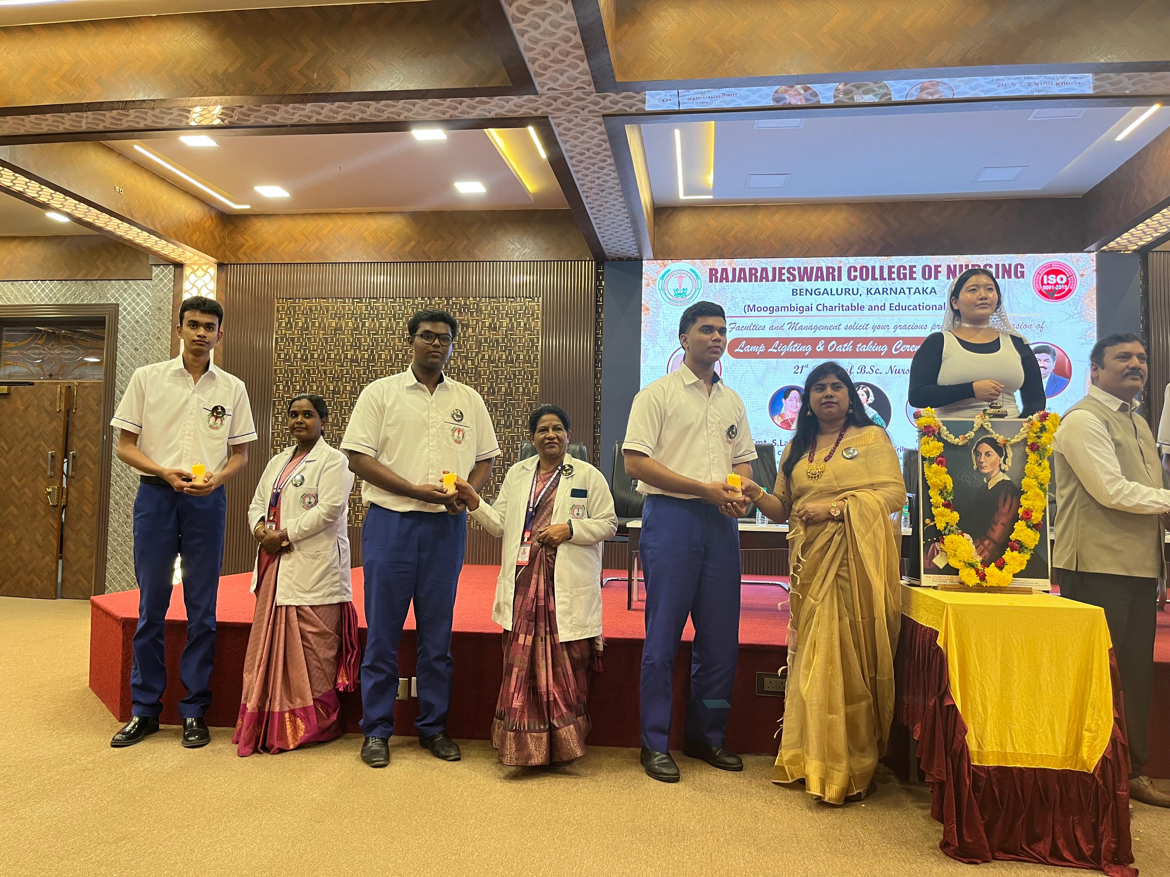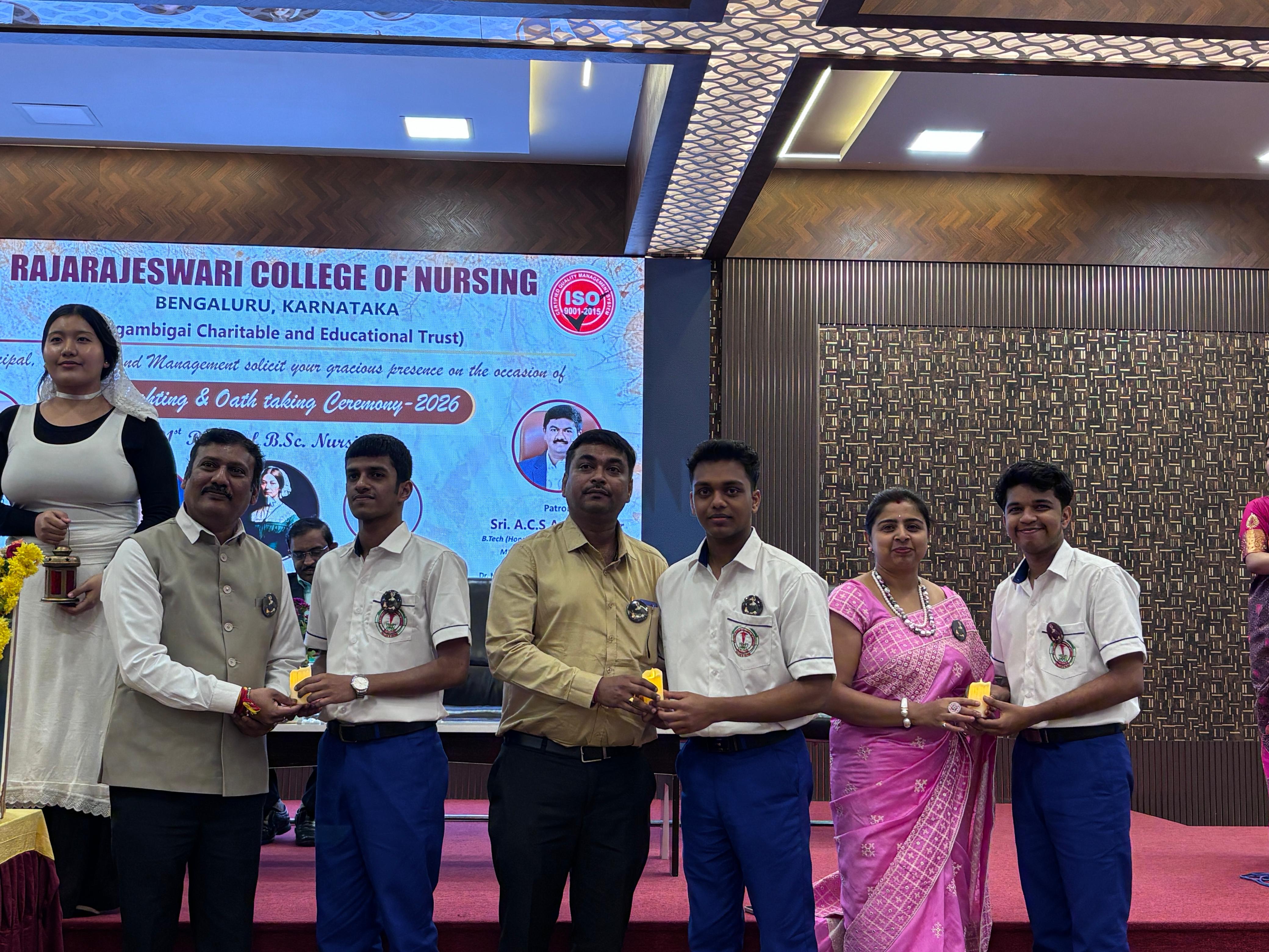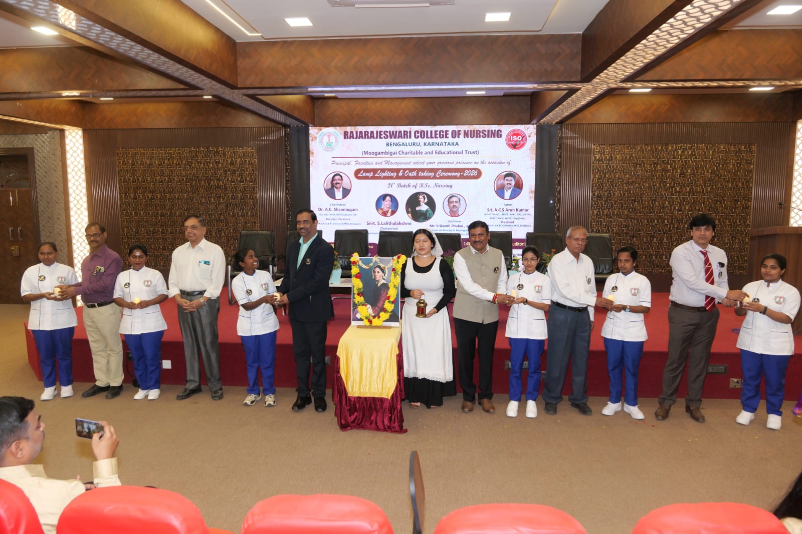 The 21st Lamp Lighting and Oath-Taking Ceremony was organized by RajaRajeswari College of Nursing on 21–01–2026. The ceremony was inaugurated by the Chief Guest, Mr. Shrikant Pulhari, Asst. Director of Nursing Education along with Mr. Seetharam C N, CEO; Dr. Sathyamurthy, Dean; Dr. Praveen Kumar, Medical Superintendent and Dr. Basavaraj Bandari, Principal, RRMCH. The lighting of the lamp symbolized the transmission of knowledge, wisdom, and professional values to the new generation of nursing students.