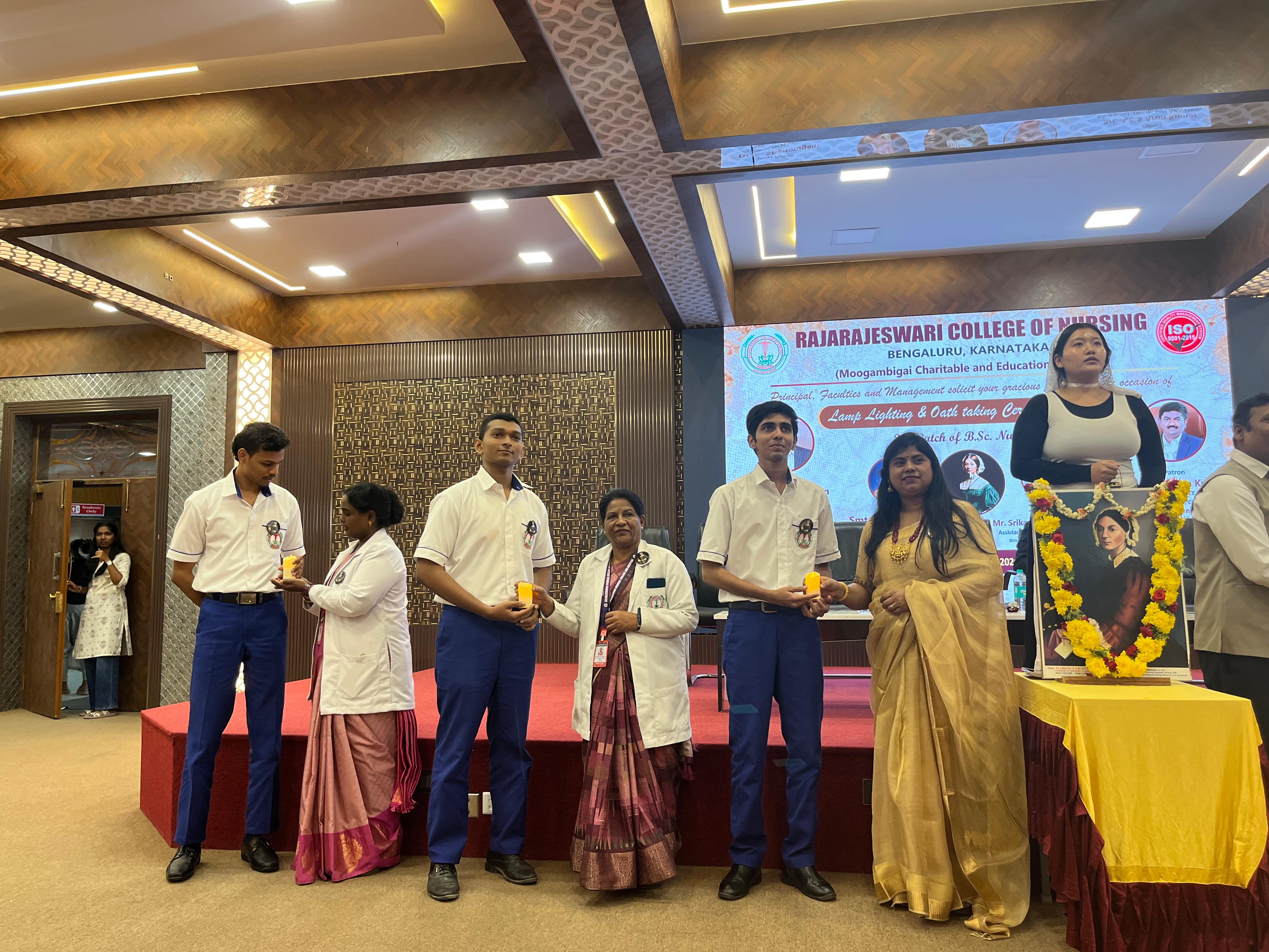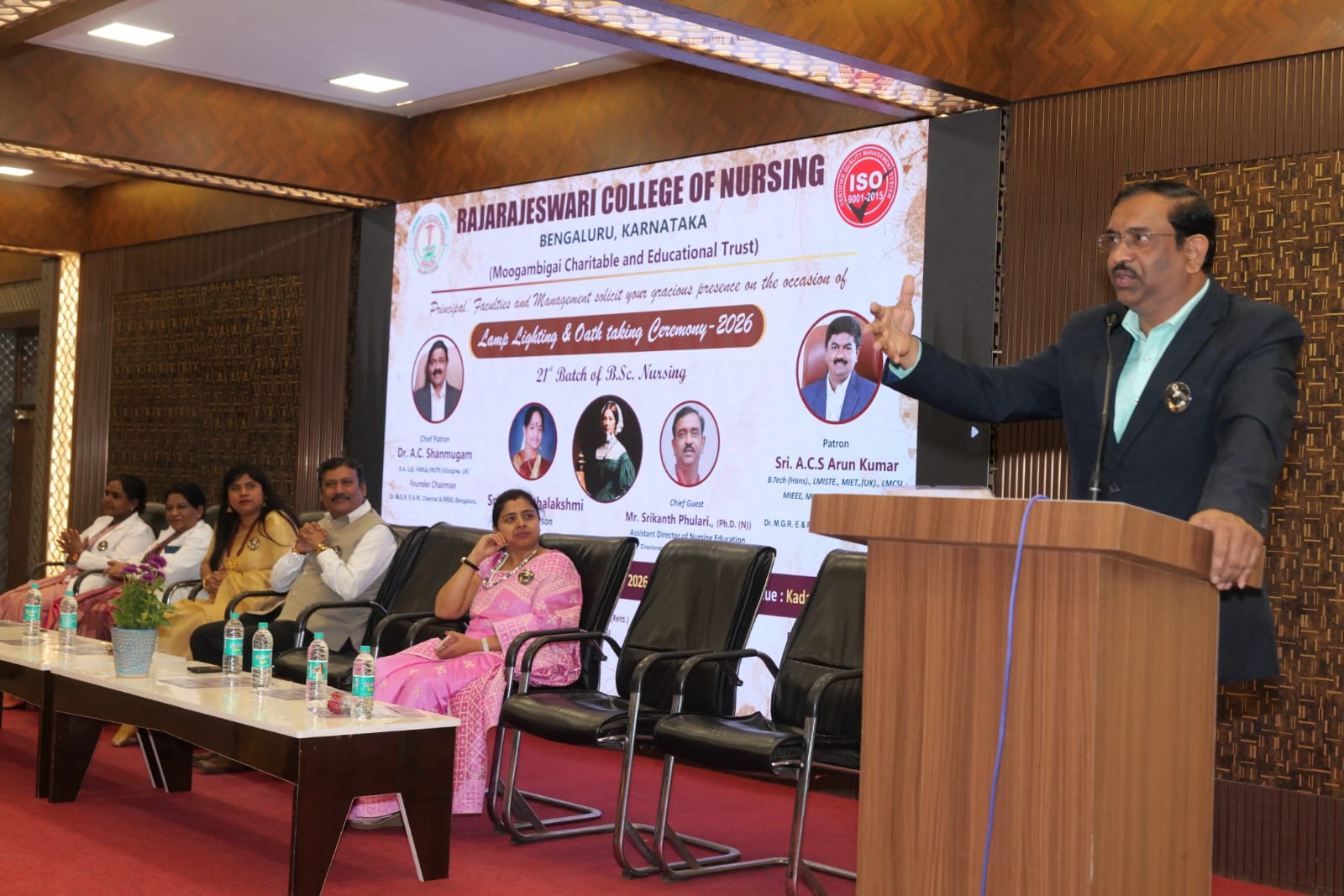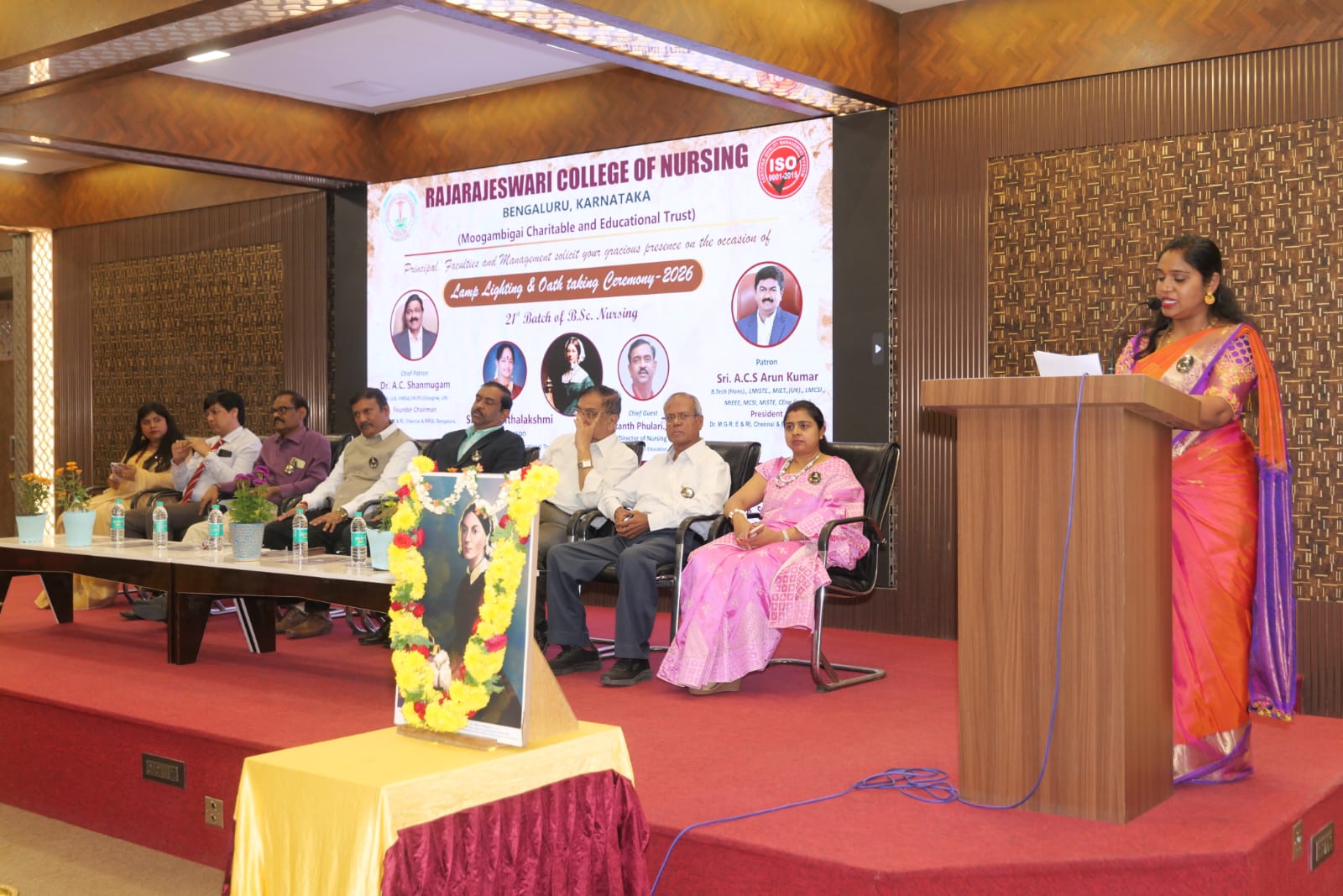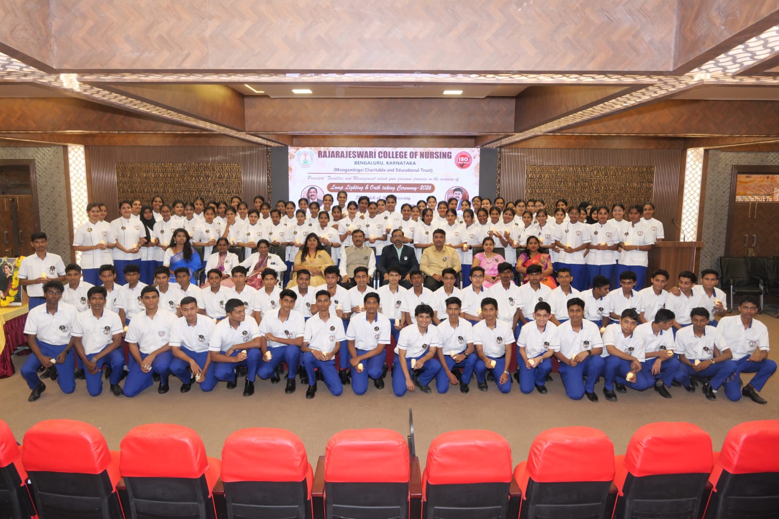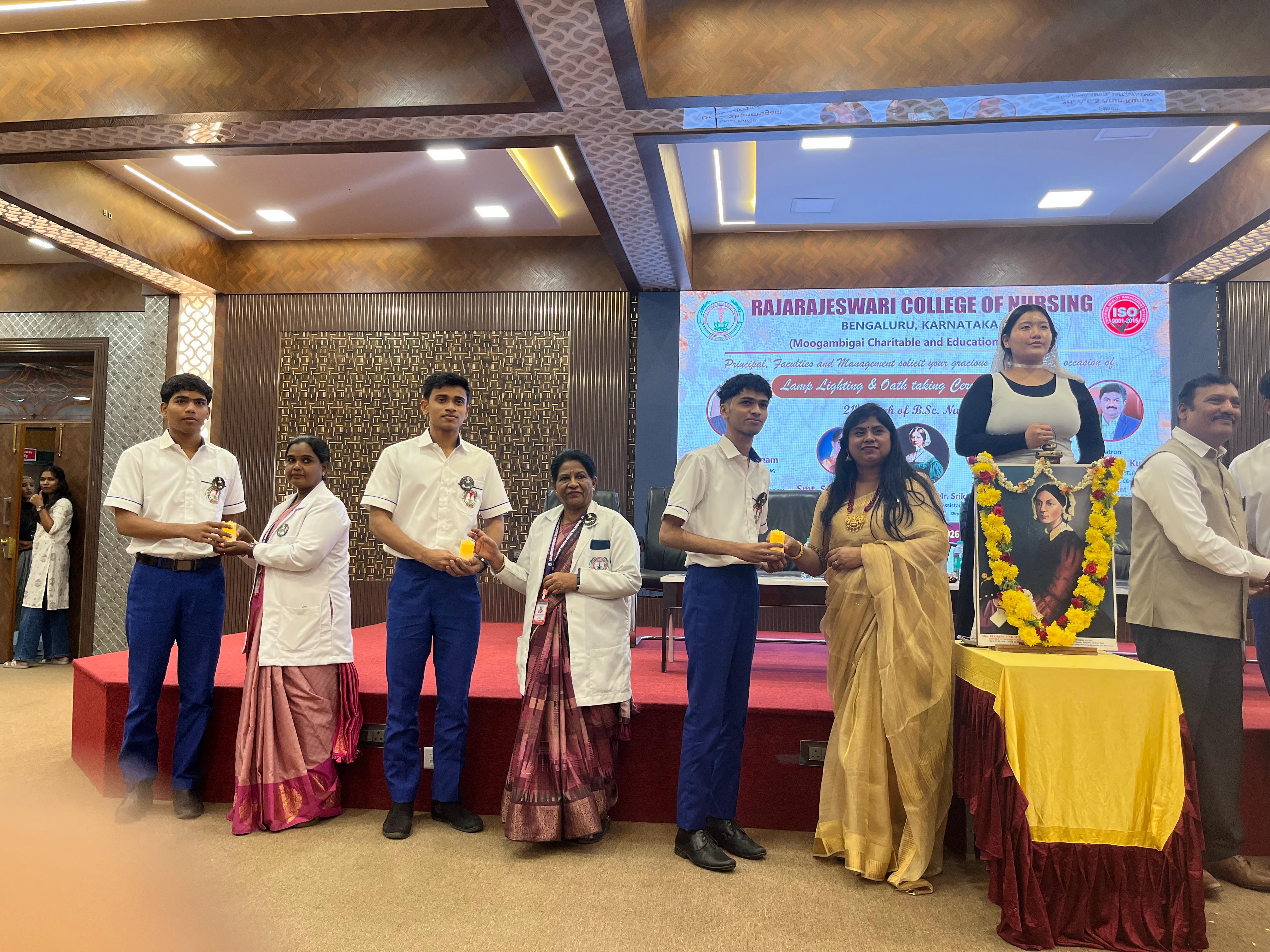 The 21st Lamp Lighting and Oath-Taking Ceremony was organized by RajaRajeswari College of Nursing on 21–01–2026. The ceremony was inaugurated by the Chief Guest, Mr. Shrikant Pulhari, Asst. Director of Nursing Education along with Mr. Seetharam C N, CEO; Dr. Sathyamurthy, Dean; Dr. Praveen Kumar, Medical Superintendent and Dr. Basavaraj Bandari, Principal, RRMCH. The lighting of the lamp symbolized the transmission of knowledge, wisdom, and professional values to the new generation of nursing students.