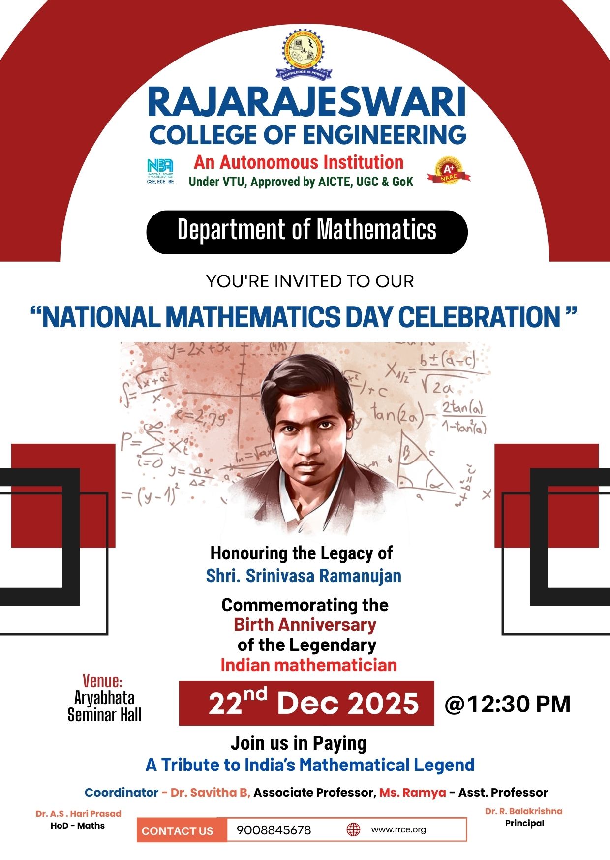 The Department of Mathematics, Rajarajeswari College of Engineering has organized the National Mathematics Day Celebration on the occasion of the birth anniversary of Shri Srinivasa Ramanujan on 22nd December 2025 at 12:30 PM in the Aryabhata Seminar Hall.
