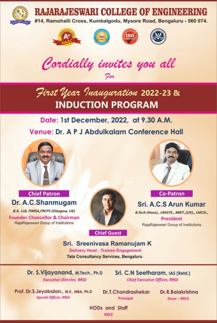 The Management, Principal and Faculty of RajaRajeswari College of Engineering cordially invite you to Induction Program for the First Year B.E. students of 2022-23 Batch on 1st December, 2022.