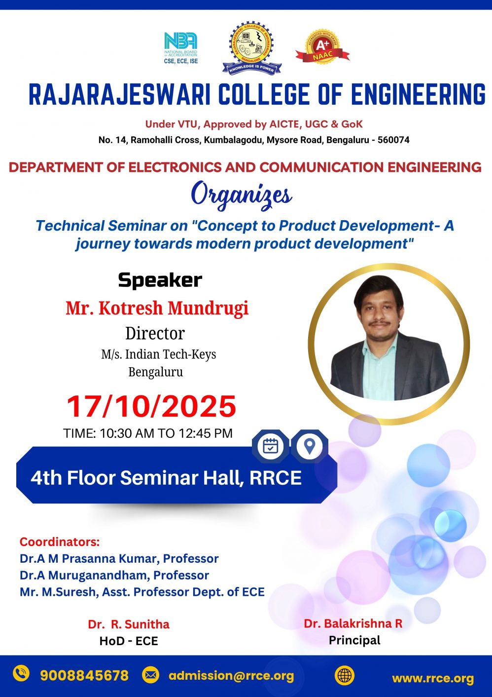 The Department of Electronics and Communication Engineering (ECE), Rajarajeswari College of Engineering, organized a Technical Seminar on the topic “Concept to Product Development – A Journey Towards Modern Product Development” on 17th October 2025.