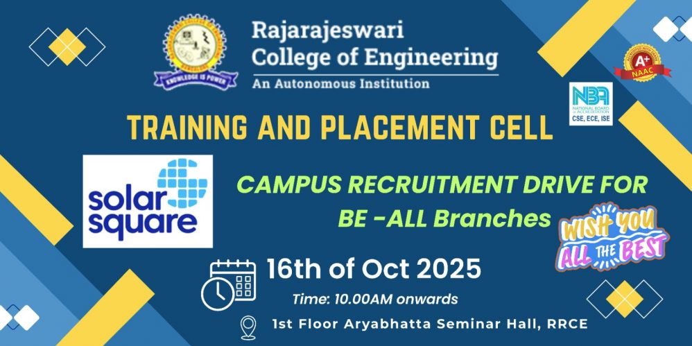 The Training and Placement Cell of Rajarajeswari College of Engineering successfully conducted a Campus Recruitment Drive with M/s. Solar Square for the 2026 B.E batch. The drive provided students with an opportunity to showcase their skills and explore promising career prospects in the industry.