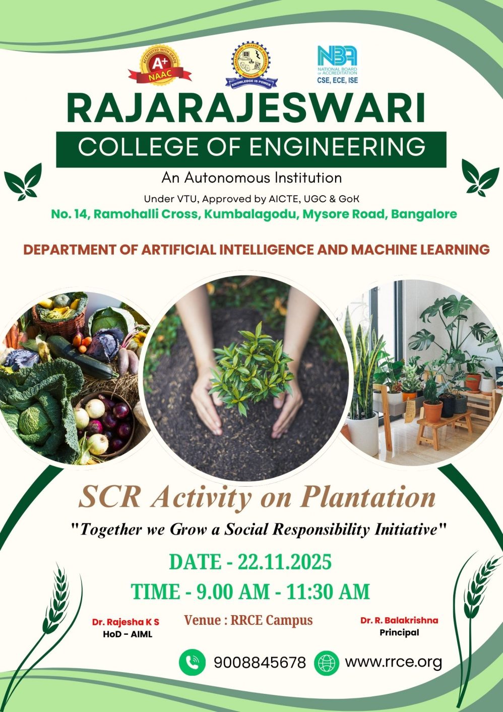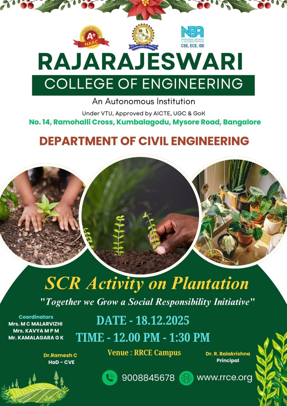 The Department of Civil Engineering successfully conducted a Plantation Drive as part of the SCR Activity on 18 December 2025 at the RRCE campus, under the theme “Together We Grow – A Social Responsibility Initiative”