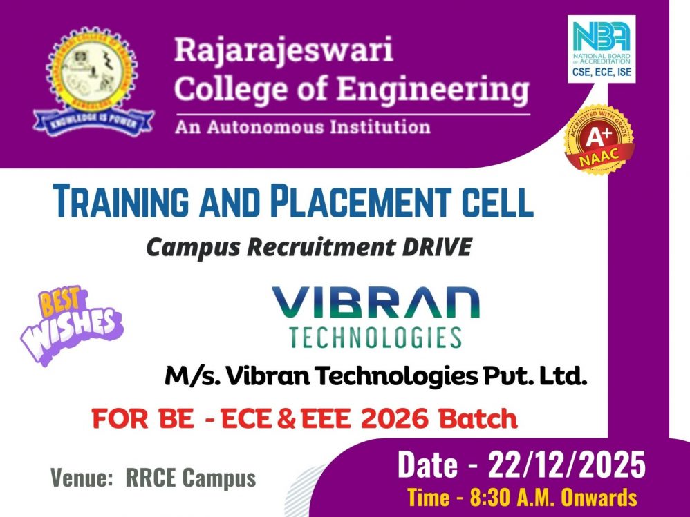The Training and Placement Cell of Rajarajeswari College of Engineering (RRCE) successfully conducted a Campus Recruitment Drive by M/s. Vibran Technologies Pvt. Ltd. for B.E. ECE and EEE students of the 2026 batch.