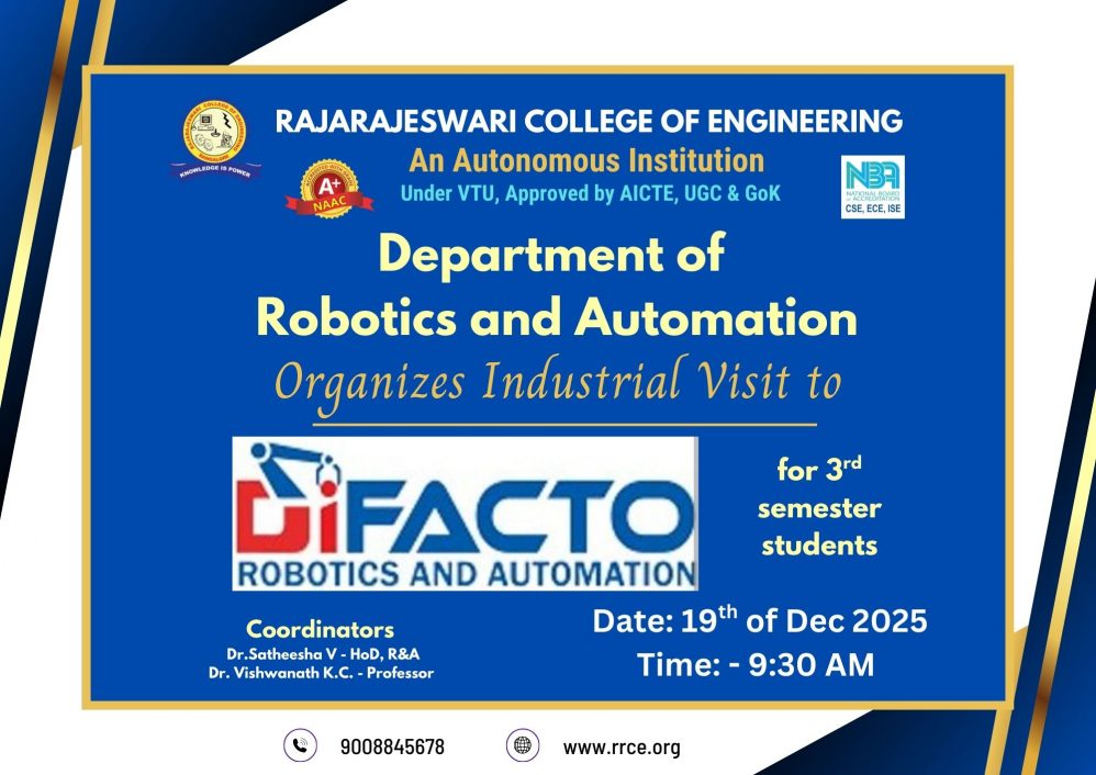 The Department of Robotics and Automation, Rajarajeswari College of Engineering (RRCE) organized an Industrial Visit for 3rd Semester students to DiFACTO on 19 December 2025.