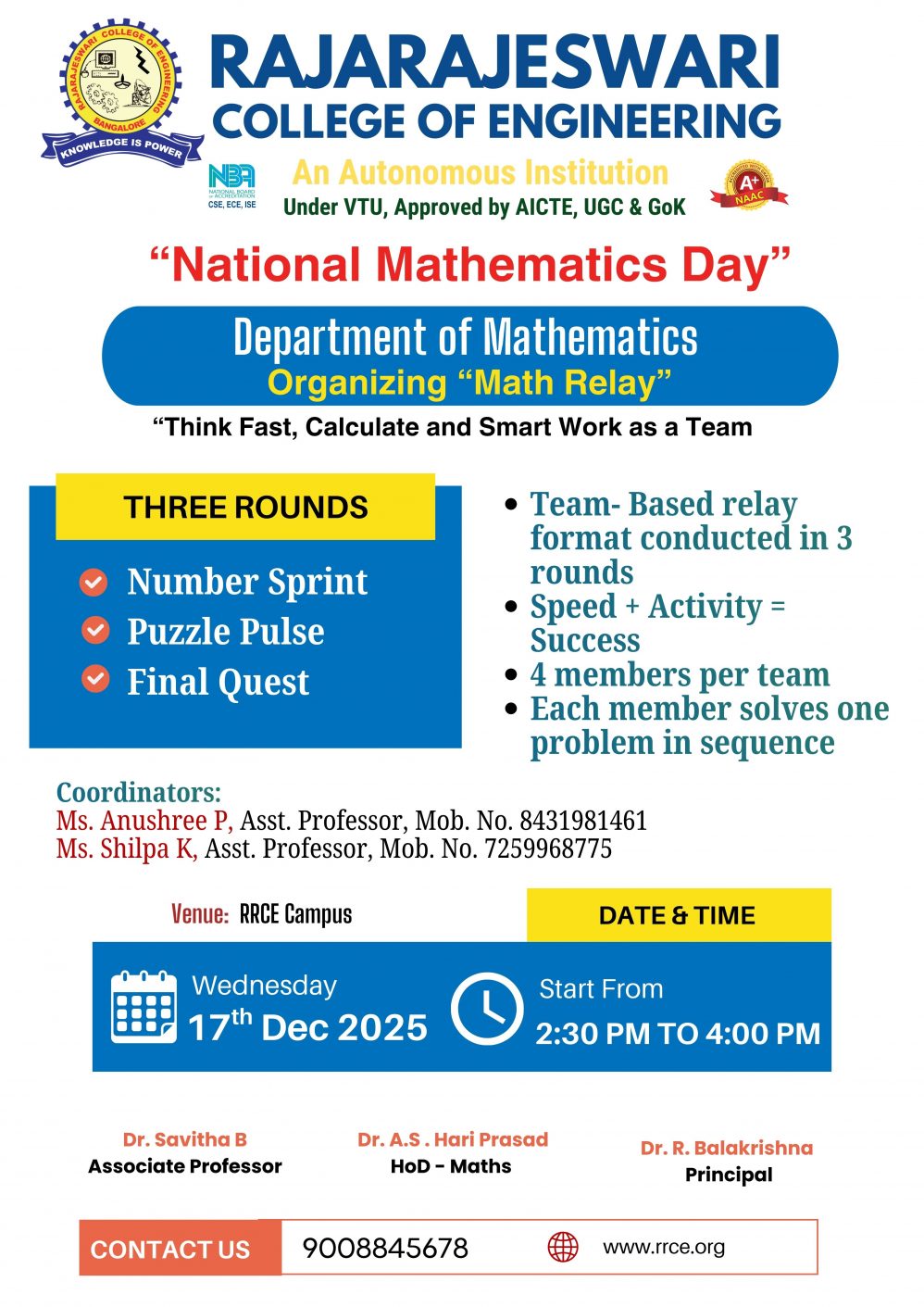 The Department of Mathematics,RRCE, successfully commemorated National Mathematics Day on the occasion of the birth anniversary of the legendary Indian mathematician Shri Srinivasa Ramanujan.