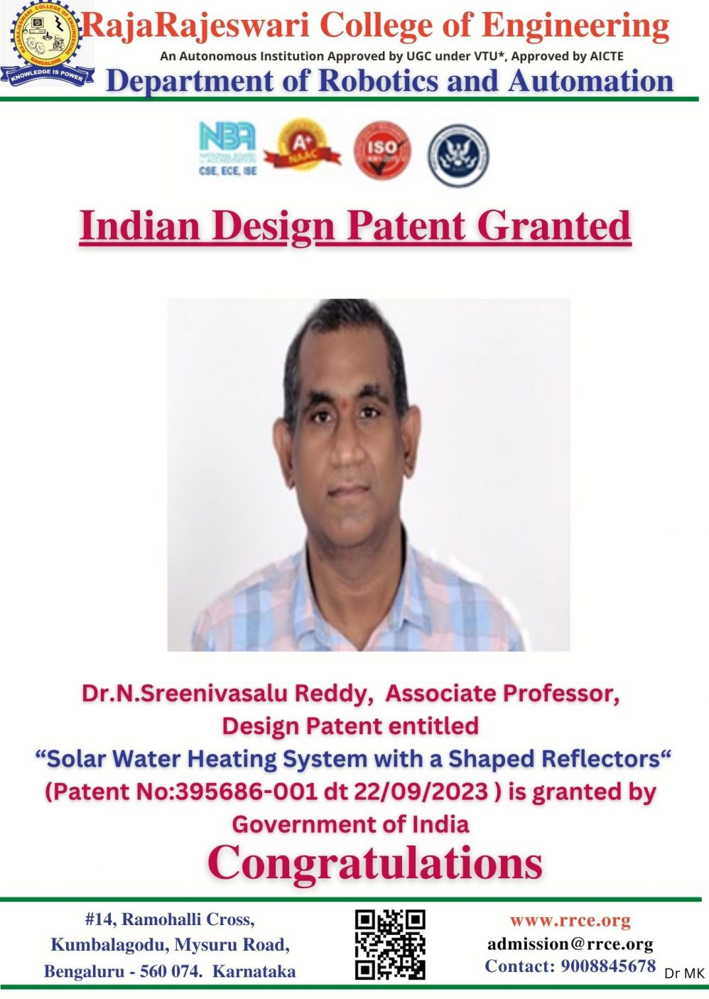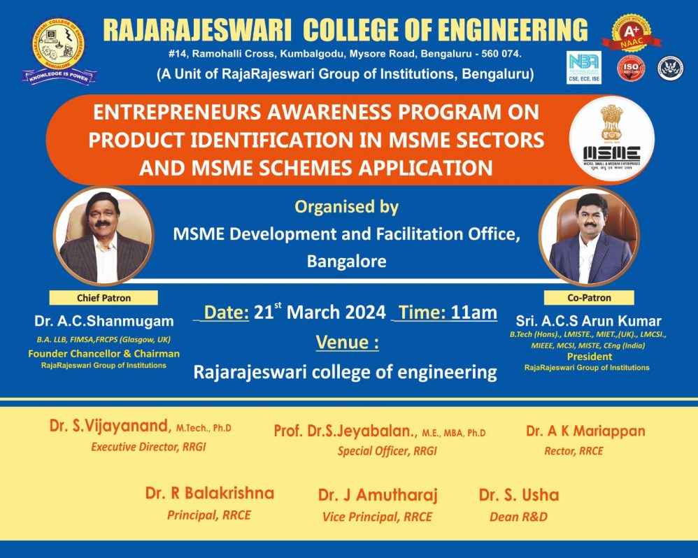We are extremely delighted to announce that the Ministry of Micro, Small and Medium Enterprises (MSME), Government of India has recognized RajaRajeswari College of Engineering (RRCE), Bengaluru as host institution for the implementation of the incubation component under the MSME Innovative Scheme.