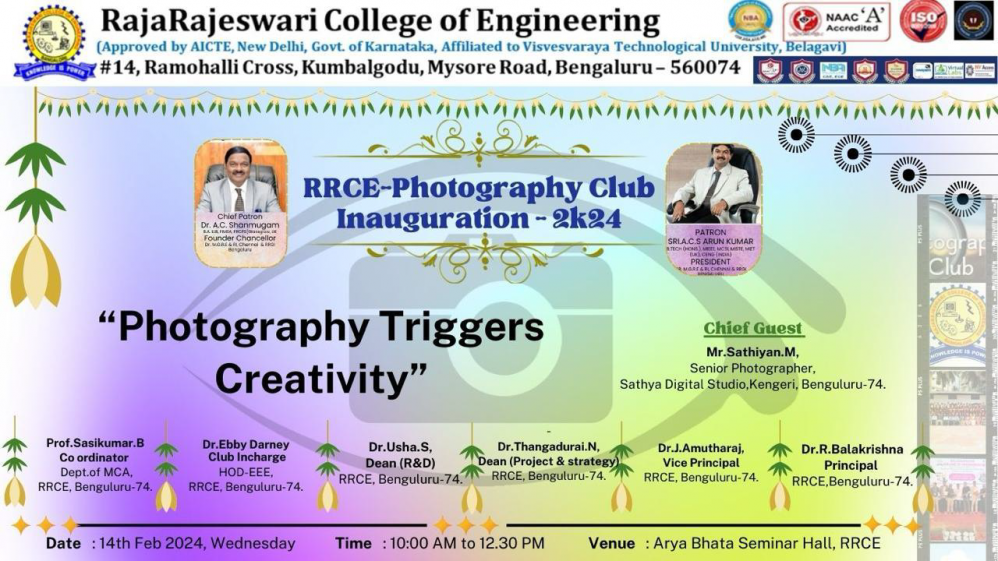 The RajaRajeswari College of Engineering under the Photography club inauguration by Prof. Sasikumar.B, MCA, Coordintor and Dr T. Subburaj and Dr.Ebby Darmey, club Members.