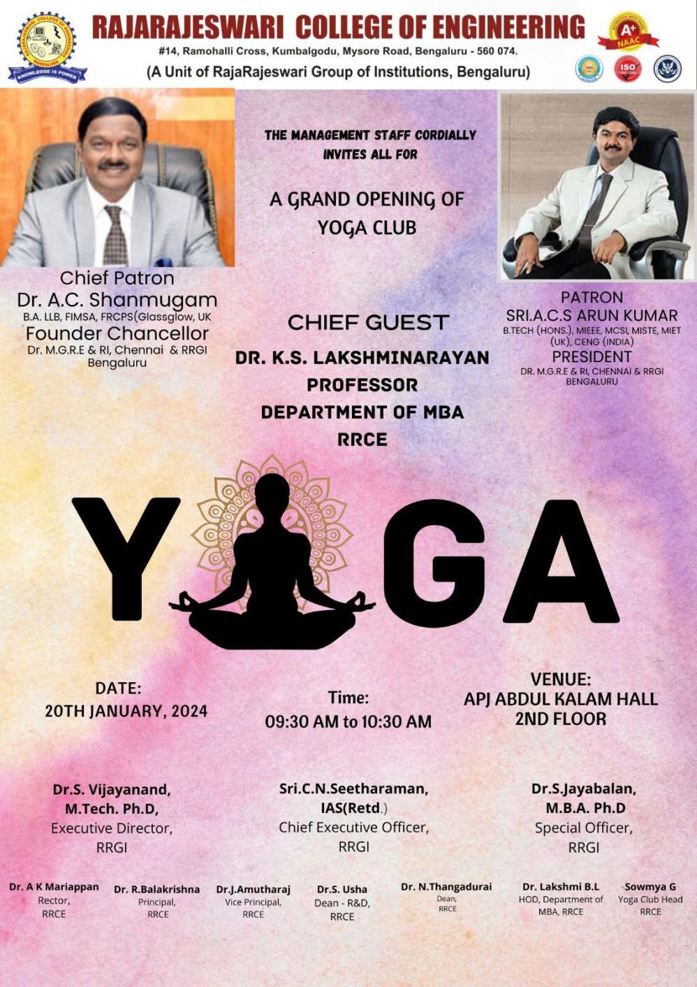 A yoga on that workshop is conducted on 20th January 2024 on Saturday for all aspiring students . This yoga was conducted by Sir. Dr.K.S Lakshminarayan professor department of MBA ,RRCE, the session started with meditation, yoga is very important to every person in a daily life.
