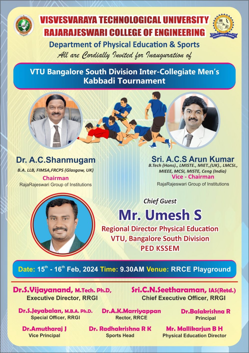Title: VTU Bangalore South Division Inter-Collegiate Men’s Kabbadi Tournament will be organized by RajaRajeswari College of Engineering, Bengaluru on 15th and 16th Feb, 2024.