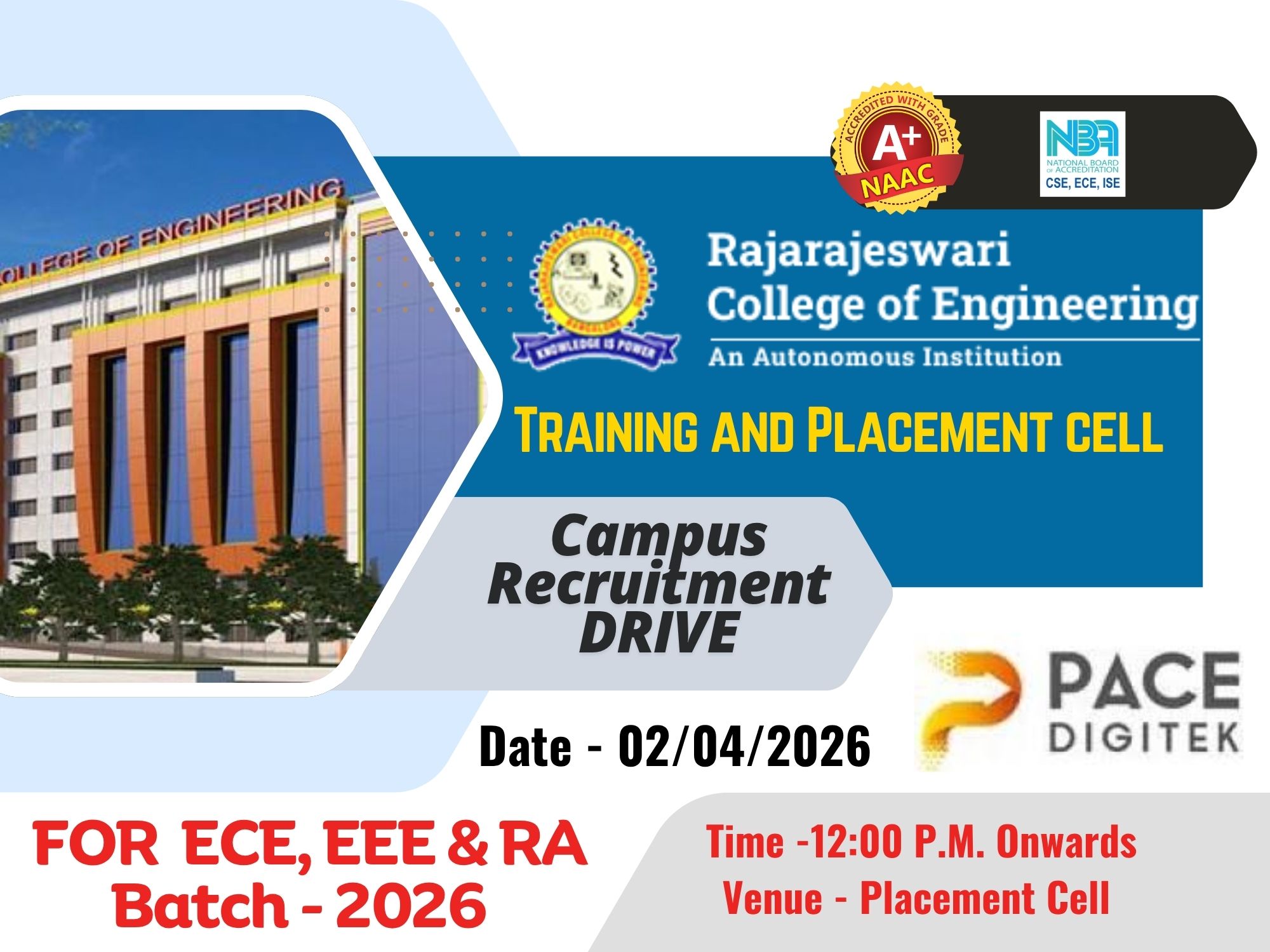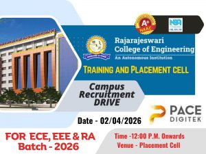 The Training and Placement Cell of Rajarajeswari College of Engineering successfully organized a Placement Drive in association with Pace Digitek Infra Pvt. Ltd. for the students of B.E – EEE, ECE, and Robotics and Automation (Batch 2026).