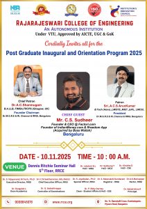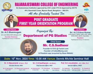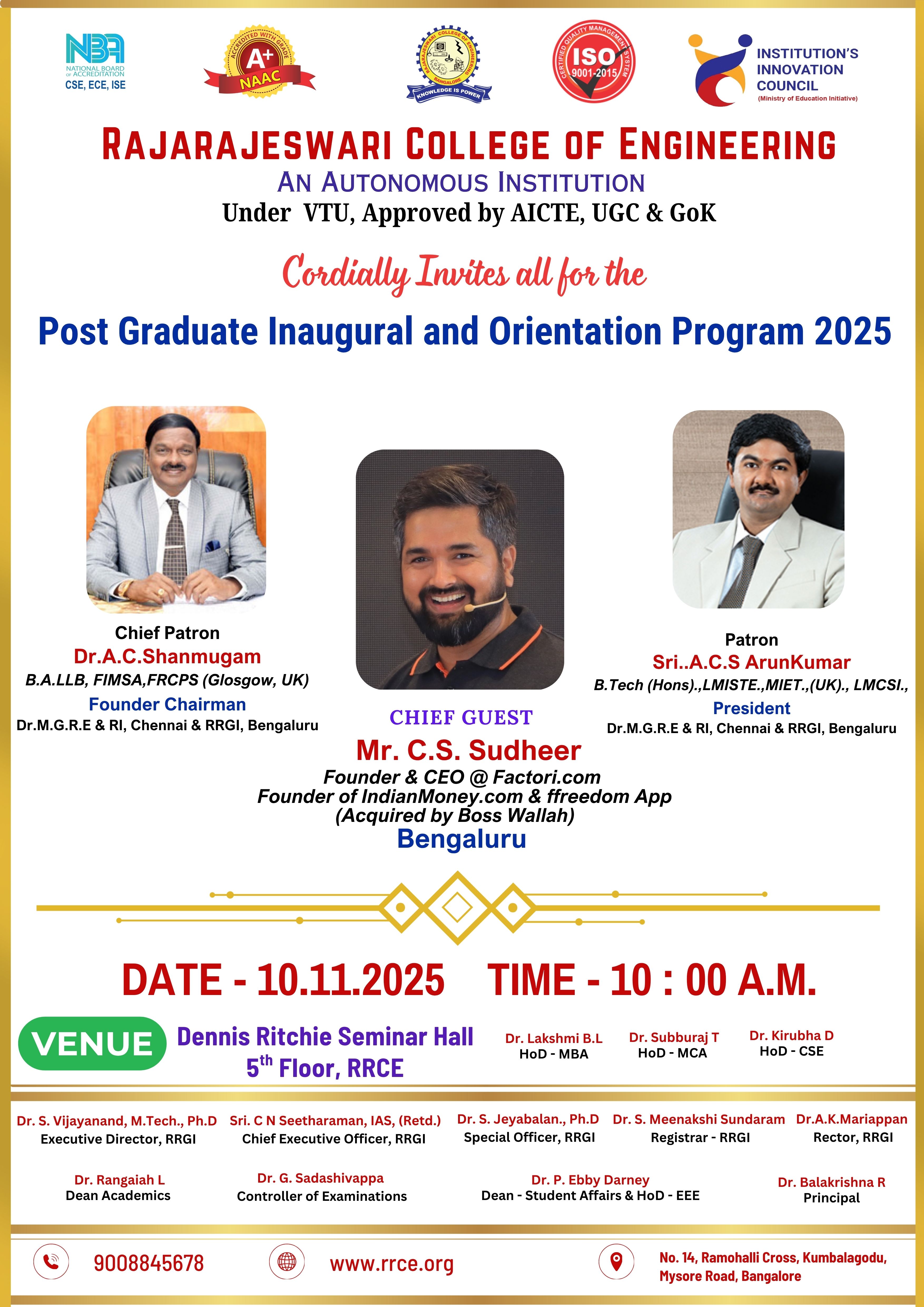 The Post Graduate Inaugural and Orientation Program 2025, held on 10th November 2025, marked a meaningful start to the academic year. RRCE warmly welcomed the new batch of MBA, MCA and MTech students, celebrating new beginnings filled with innovation, learning and growth.