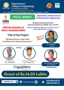 Rajarajeswari College of Engineering (RRCE) is delighted to announce a remarkable achievement by the Department of Electronics and Communication Engineering (ECE) at the prestigious MSME Idea Hackathon 5.0 (Smart & Sustainable MSMEs), organized by the Business Incubation Center and approved by the Ministry of MSME, Government of India.