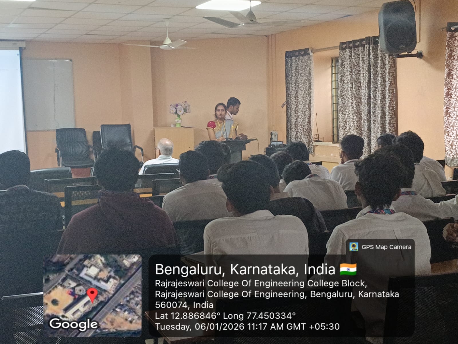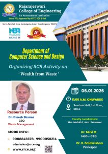 The Department of Computer Science & Design (CSD), Rajarajeswari College of Engineering (RRCE), organized an SCR Activity on “Wealth from Waste” on 06 January 2026. The session, delivered by Dr. Dinesh Sharma, CEO – Waste Management, provided valuable insights into sustainable waste management practices and innovative approaches to transforming waste into useful resources. The event successfully created awareness on sustainability and environmental responsibility among students.