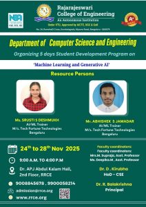 The Department of Computer Science and Engineering is conducting a 5-Day Student Development Program on “Machine Learning and Generative AI” from 24th to 28th November 2025, at the Dr. APJ Abdul Kalam Hall, 2nd Floor, RRCE.