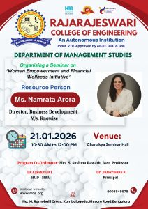 The Department of Management Studies, RRCE is organizing a seminar on Women Empowerment and Financial Wellness on 21 January 2026, from 10:30 AM to 12:00 PM at Chanakya Seminar Hall.