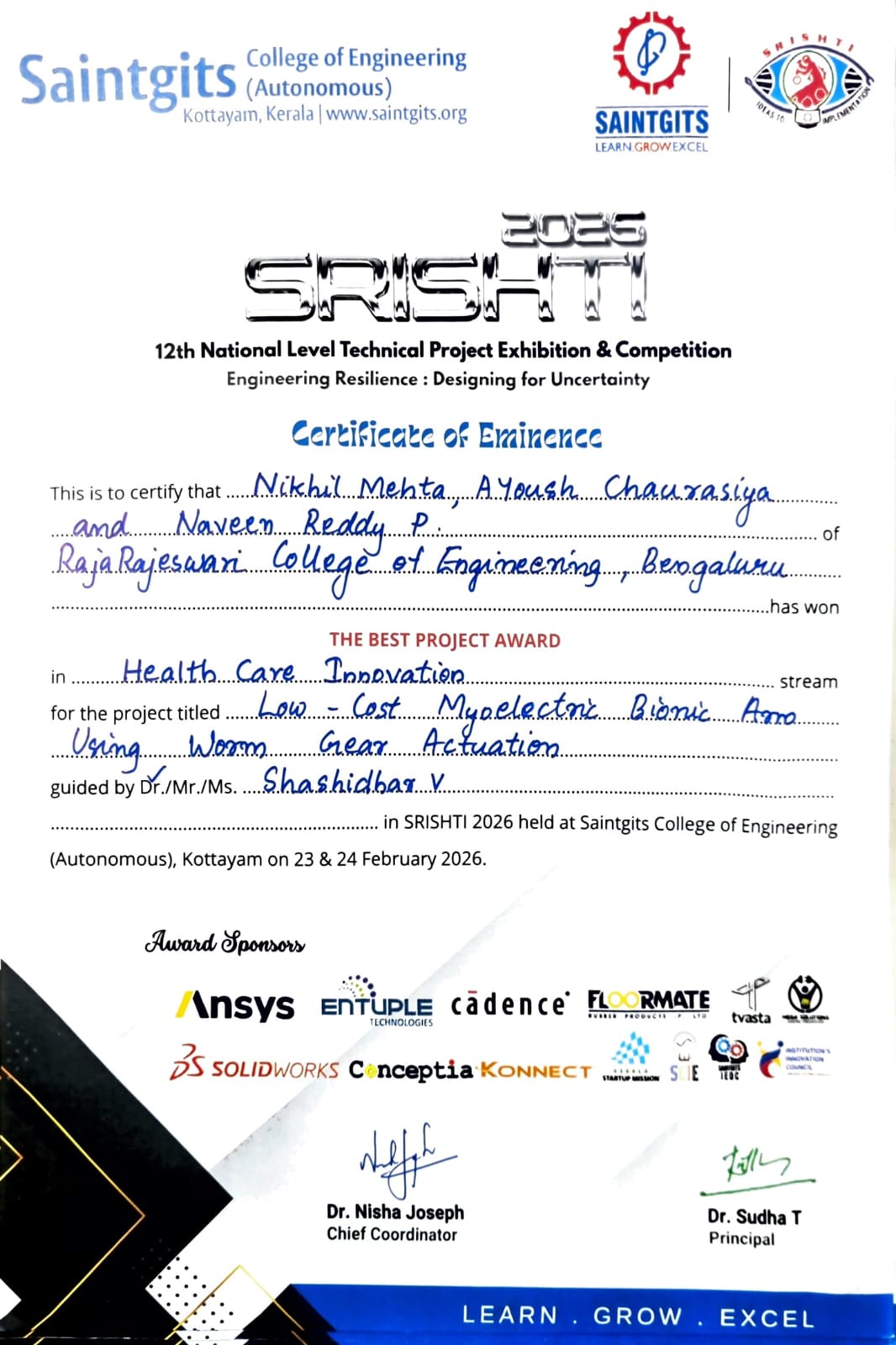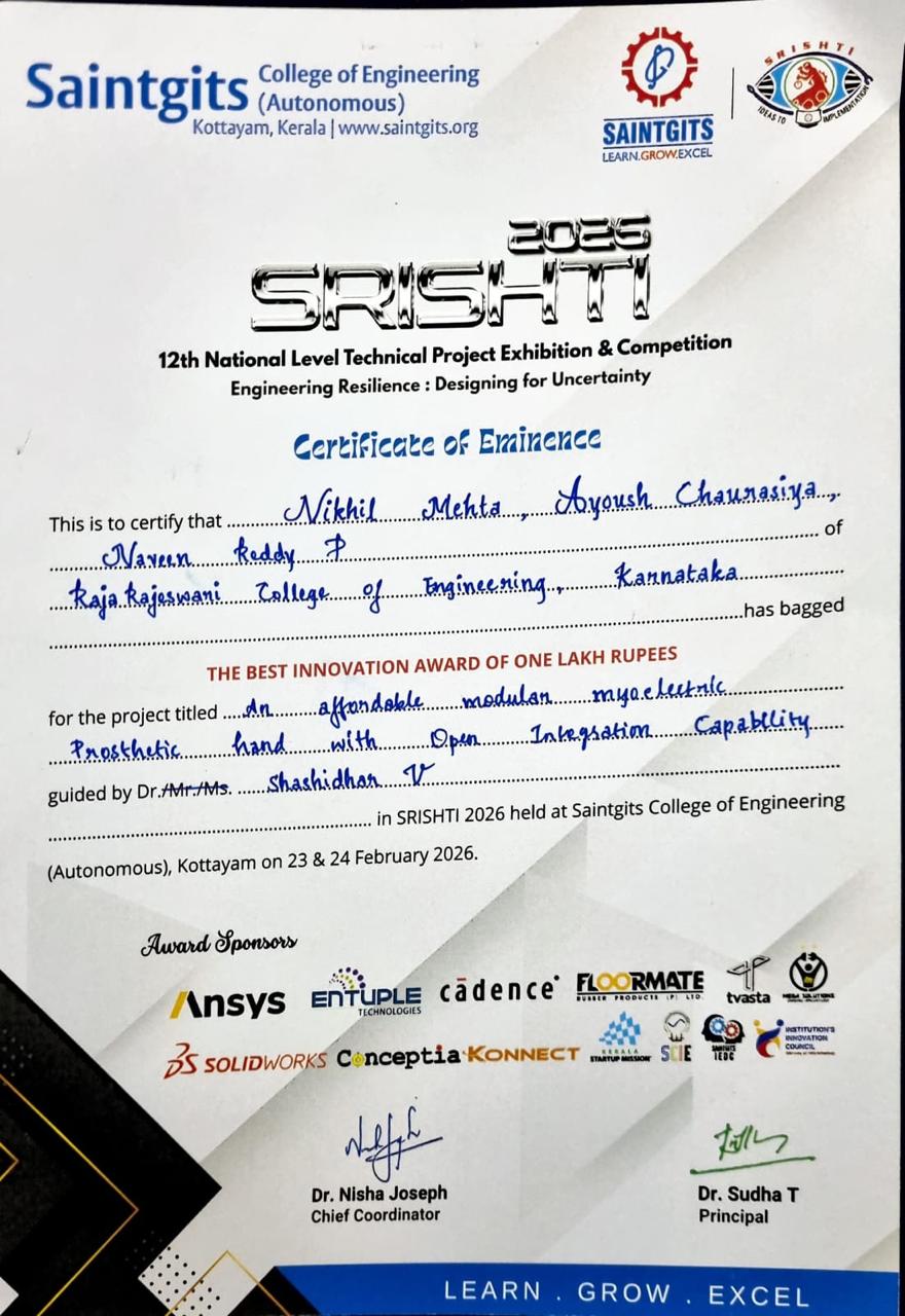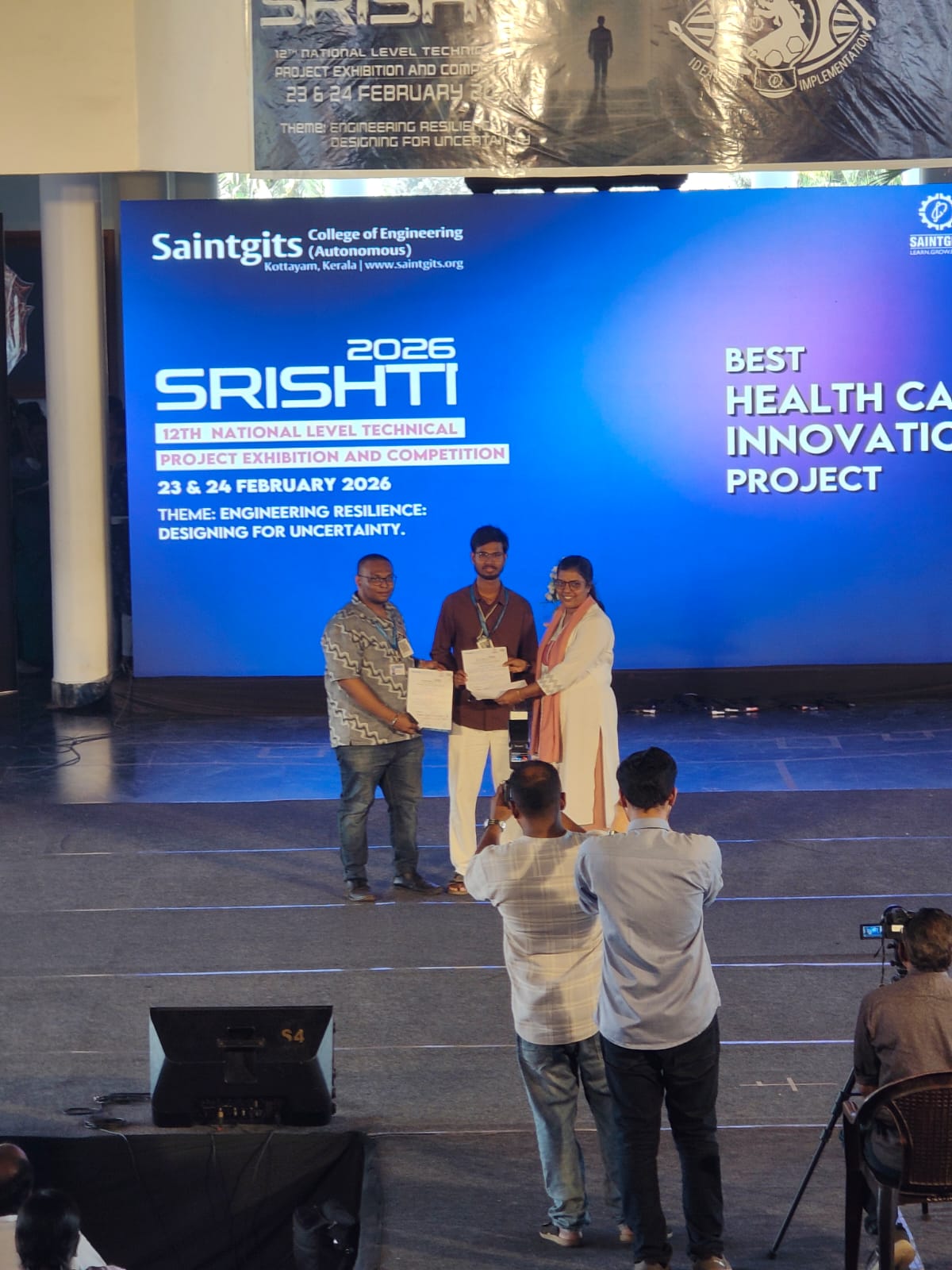 Our 6th Semester students, Mr. Nikhil Mehta, Mr. Naveen Reddy, and Mr. Ayoush, participated in SRISHTI 2026 held on 23rd–24th February 2026 at Saintgits College of Engineering, Kerala, and secured remarkable achievements: