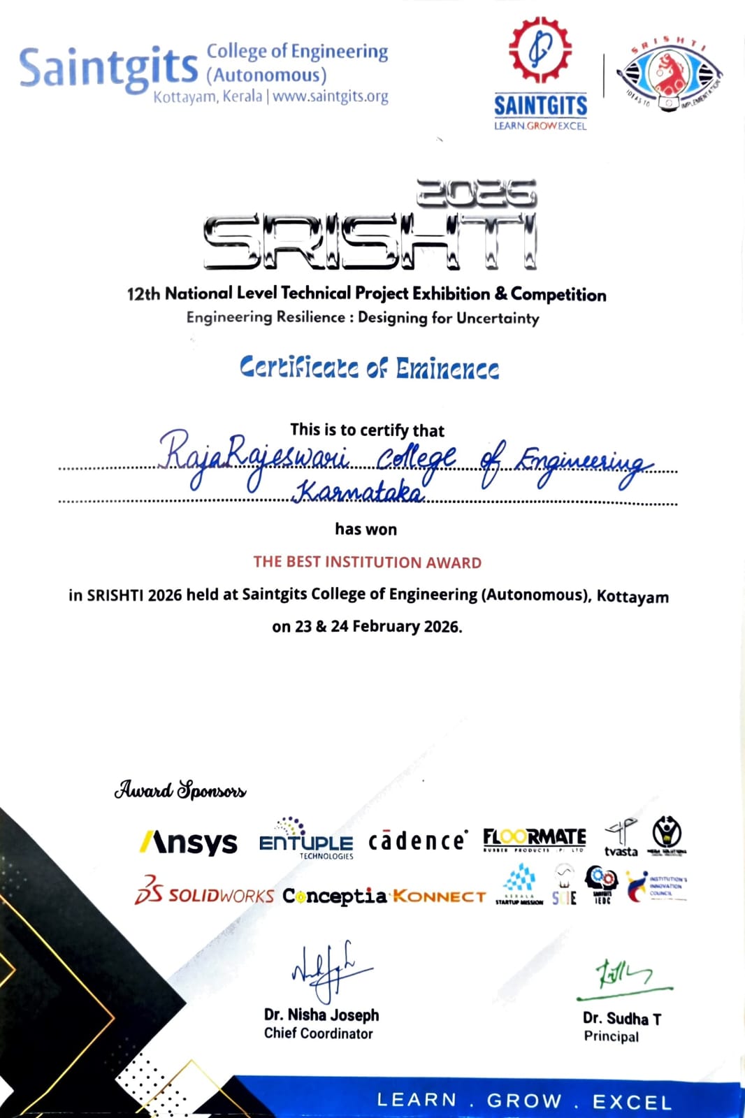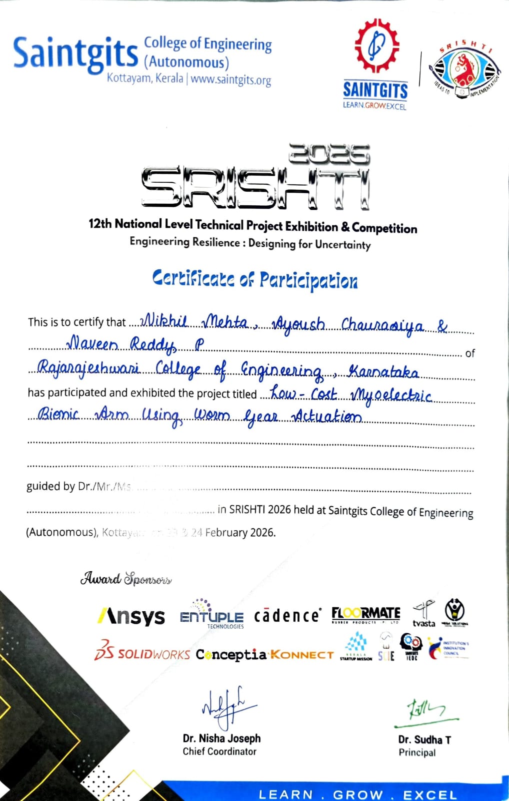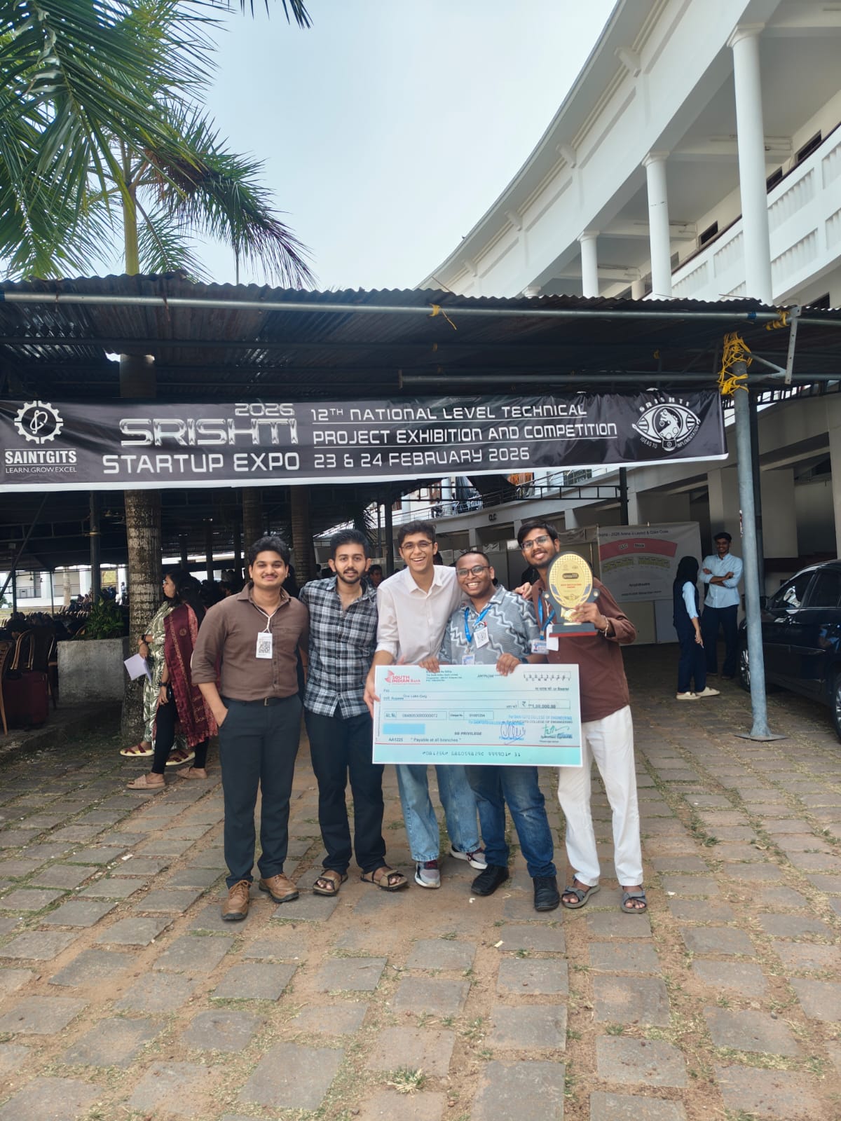Our 6th Semester students, Mr. Nikhil Mehta, Mr. Naveen Reddy, and Mr. Ayoush, participated in SRISHTI 2026 held on 23rd–24th February 2026 at Saintgits College of Engineering, Kerala, and secured remarkable achievements: