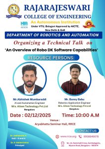 The Department of Robotics & Automation has organizing a Technical Talk on “An Overview of RoboDK Software Capabilities” on 02 December 2025 at the Aryabhatta Seminar Hall, RRCE. The session will be delivered by Mr. Abhishek Mumbaraddi, AI and Automation Engineer, and Mr. Bonny Babu, Robotics Application Engineer from Altem Technology Pvt. Ltd., Bengaluru.